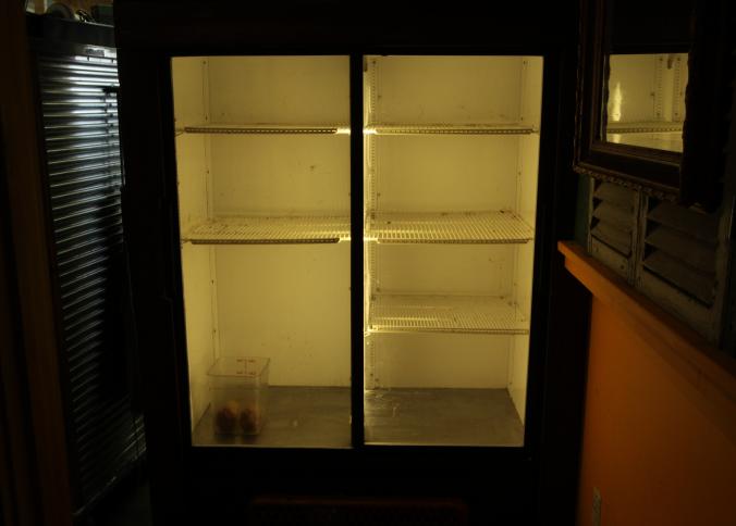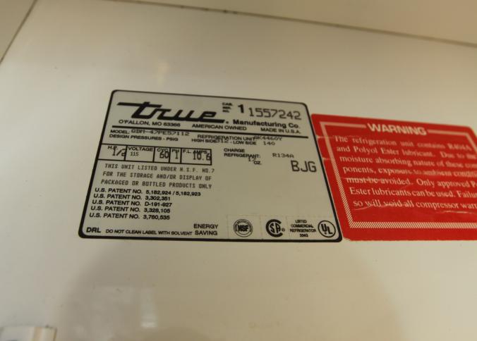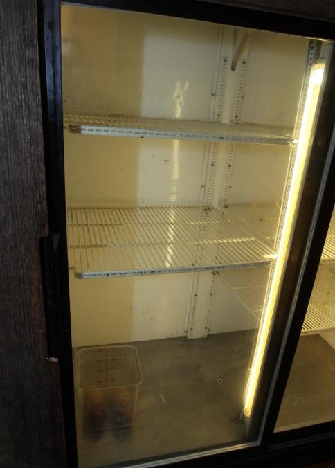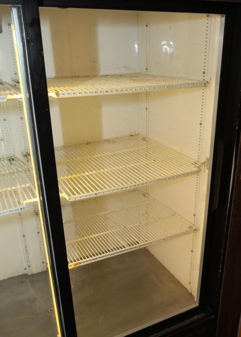 True sliding door cooler with adjustable interior shelves model GDM-47PE57112. Appears to be in working condition. 54" x 29" x 79" tall. Buyer is responsible for proper and safe removal to the first disconnect.