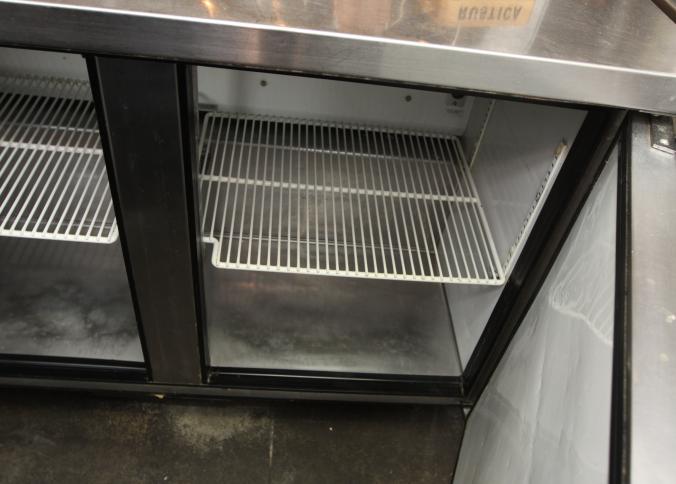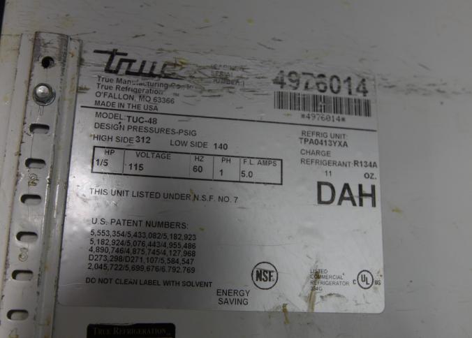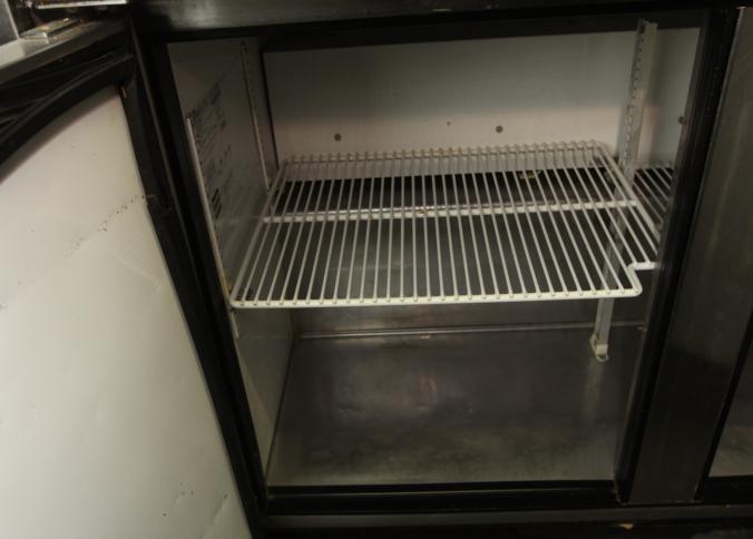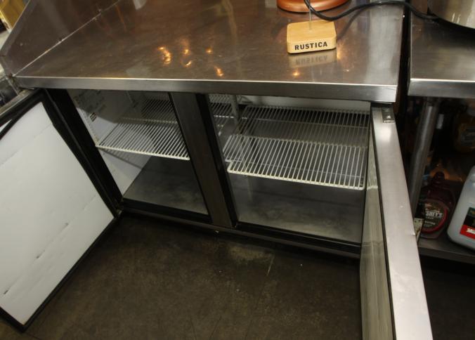True stainless steel two door fridge model number TUC-48, with four interior shelves 48.5" x 30" x 36" tall. Owner reports in working condition.