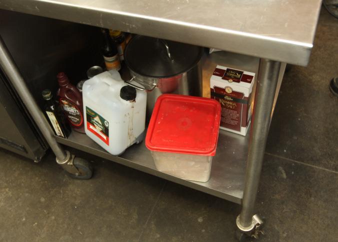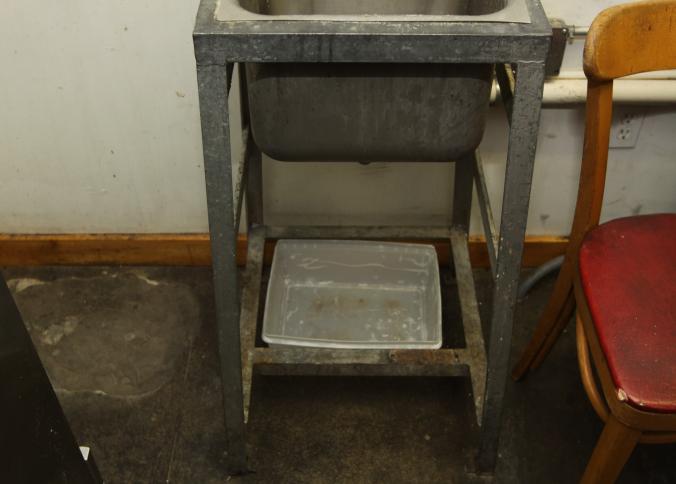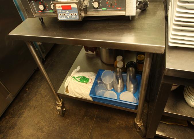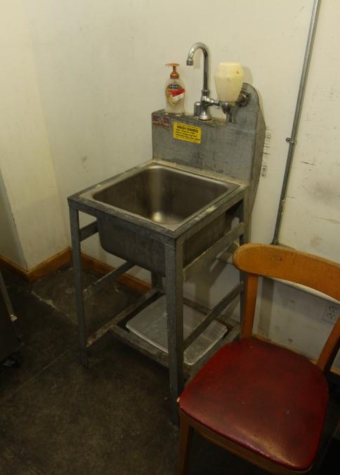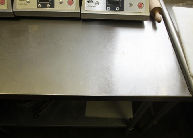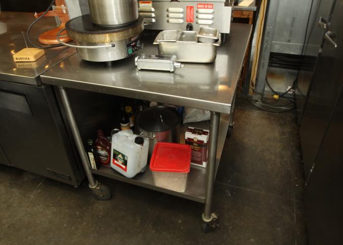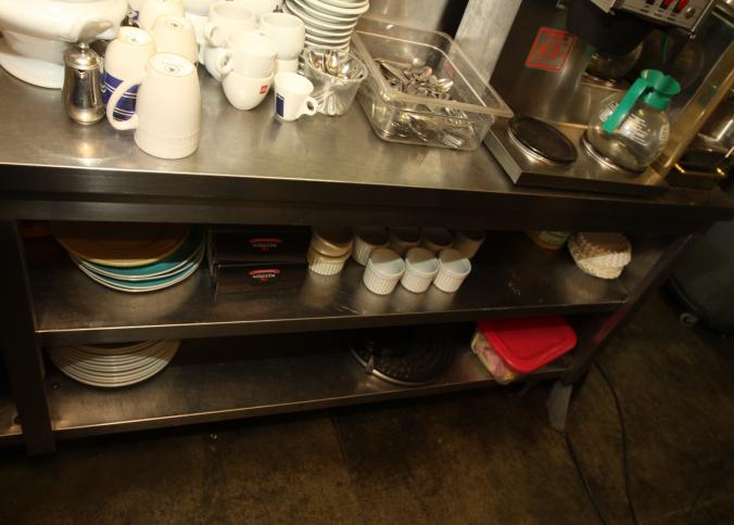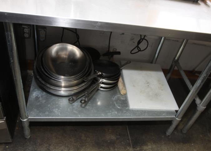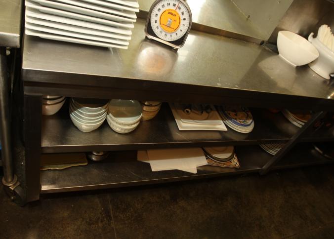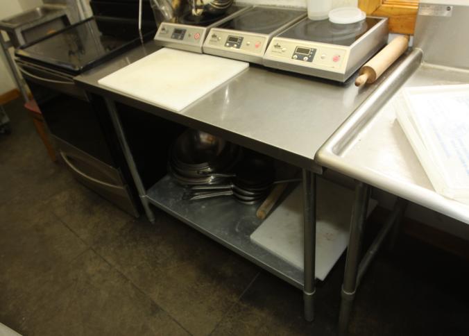 Stainless steel prep tables incl table with lower shelf on casters 36" x 42" x 36" tall, long prep table with interior shelves, approx. 120" long x 16" x 35" tall, last with lower shelf 48" x 30" x 35" tall, also incl single bay sink 21" x 17.5" x 50.5" tall. Buyer must take all. Buyer is responsible for proper and safe removal to the first disconnect incl capping of any necessary lines.