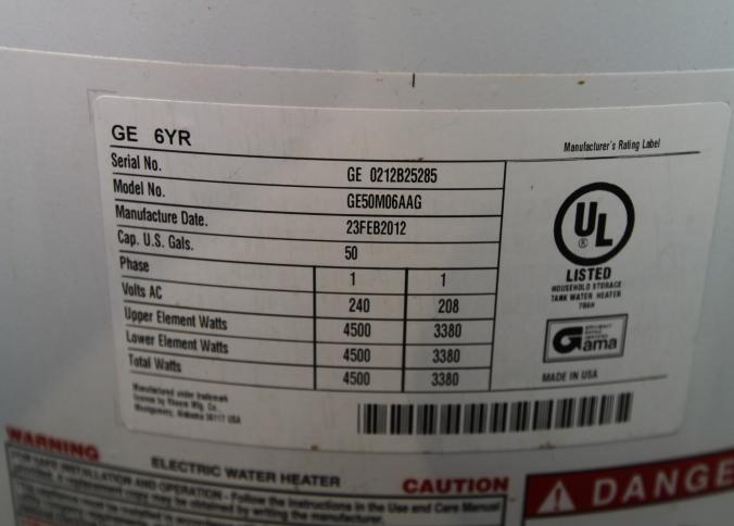 GE 6YR electric hot water heater model GE50M06AAG, serial number GE0212B35285 22" dia x 46.5" tall. Owner reports in working condition. Buyer is responsible for proper and safe removal to the first disconnect incl capping of any necessary lines. Located downstairs, with wide stairway for removal.