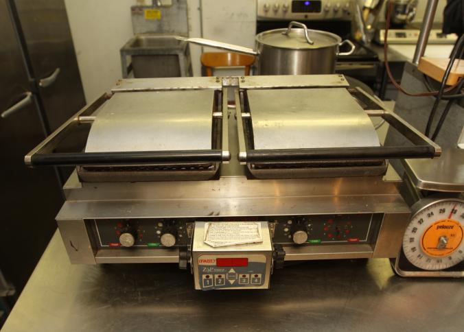 Lang Pane Bella stainless and cast panini maker with Fast Zap Timer and dual presses. Marked "Made in USA" 25" x 17" x 12" tall. Owner reports in working condition. Excluding other lots.