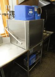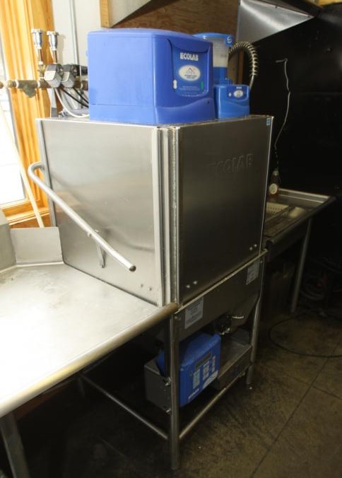 Ecolab stainless steel dishwasher model Apex TSC serial number 071227349, 25.5" square x approx. 74" tall, also incl dish racks, rack holder, soap dispensers, and electronic control. In working condition, still in use. Buyer is responsible for proper and safe removal to the first disconnect incl capping of any necessary lines.