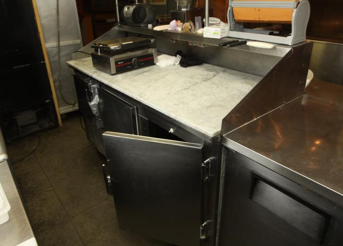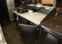 Stainless steel prep area over three door cooler and cutting board top. Turns on, owner reports working condition. 72.5" x 33.5" x 47" tall. Excluding contents, other lots. Buyer is responsible for proper and safe removal to the first disconnect incl capping of any necessary lines. Excluding other lots and contents.