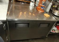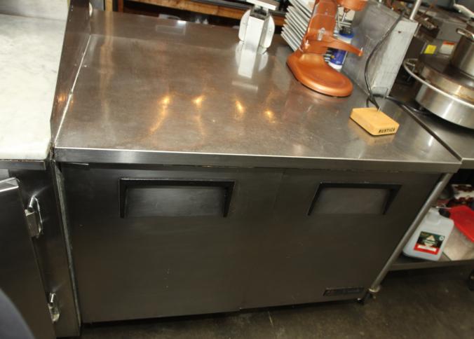 True stainless steel two door fridge model number TUC-48, with four interior shelves 48.5" x 30" x 36" tall. Owner reports in working condition.