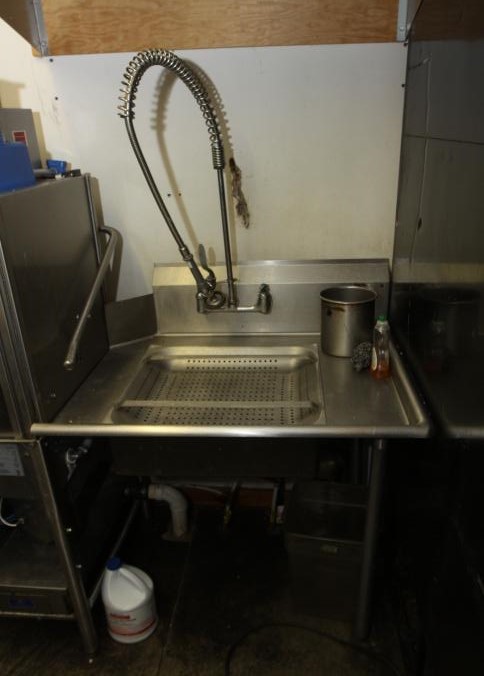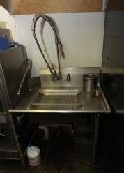 Stainless steel dishwasher side table attachments incl dish washing sink with strainer and overhead faucet. Both approx. 36" x 30" x 45" tall. In working condition, still in use. Excluding contents and other lots. Buyer is responsible for proper and safe removal to the first disconnect incl capping of any necessary lines.