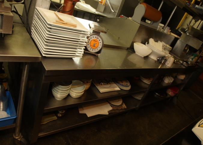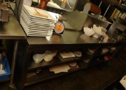 Stainless steel prep tables incl table with lower shelf on casters 36" x 42" x 36" tall, long prep table with interior shelves, approx. 120" long x 16" x 35" tall, last with lower shelf 48" x 30" x 35" tall, also incl single bay sink 21" x 17.5" x 50.5" tall. Buyer must take all. Buyer is responsible for proper and safe removal to the first disconnect incl capping of any necessary lines.