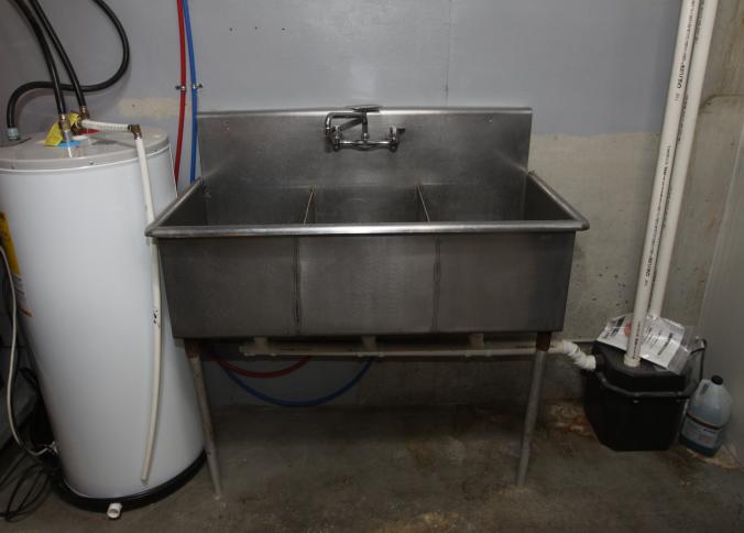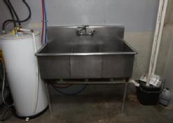 Stainless steel three bay sink in working condition, with faucet. 51" x 25" x 48" tall. Buyer is responsible for proper and safe removal to the first disconnect incl capping of any necessary lines. Located downstairs with wide stairway for removal.