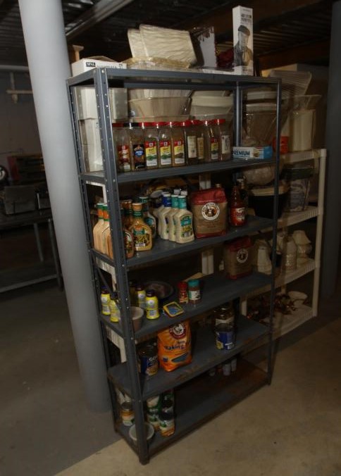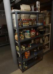 Metal racks and shelving units, largest rack on casters 48" x 18" x 76" tall. Eight pieces total. Excluding contents and other lots. Located downstairs, with wide stairway for removal.