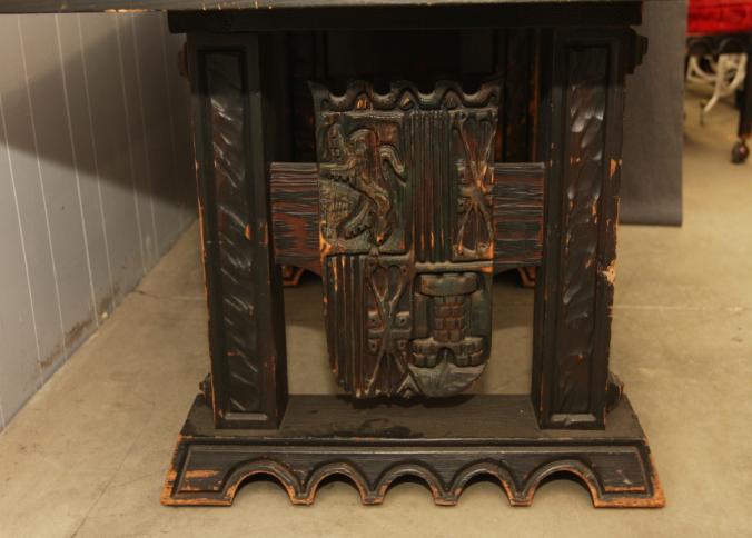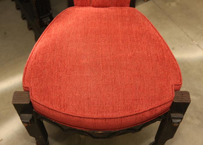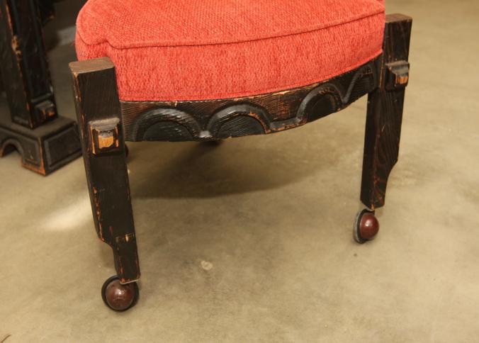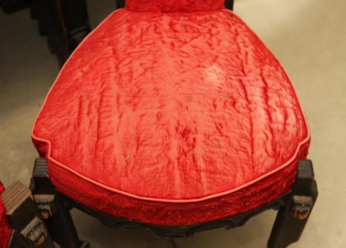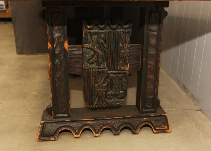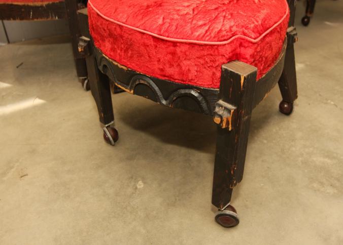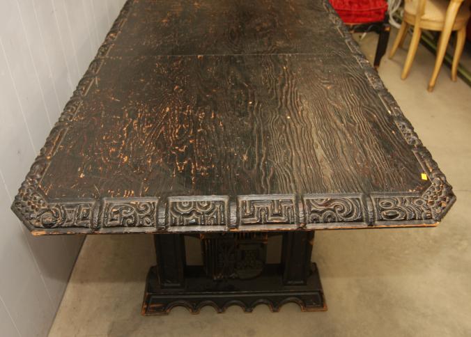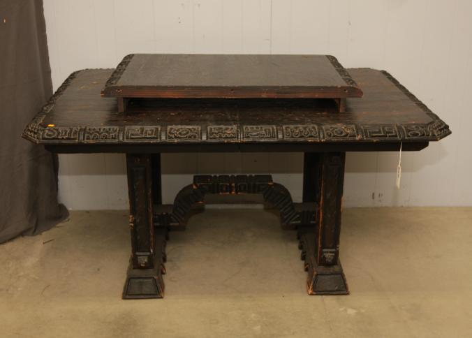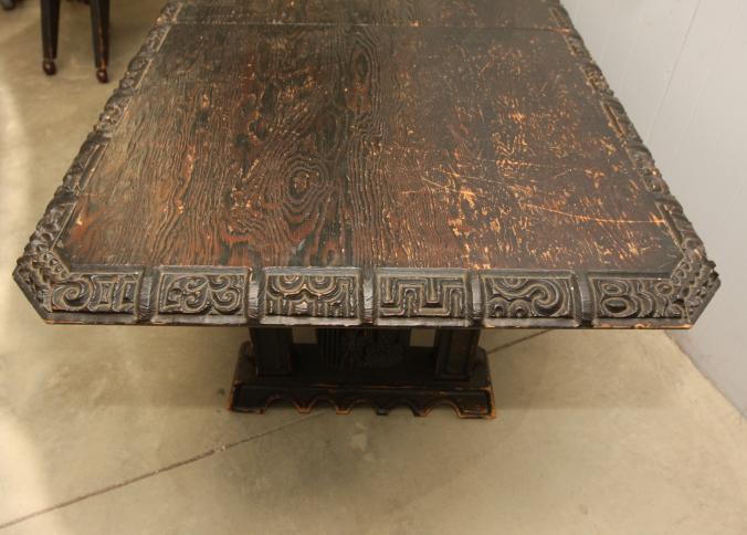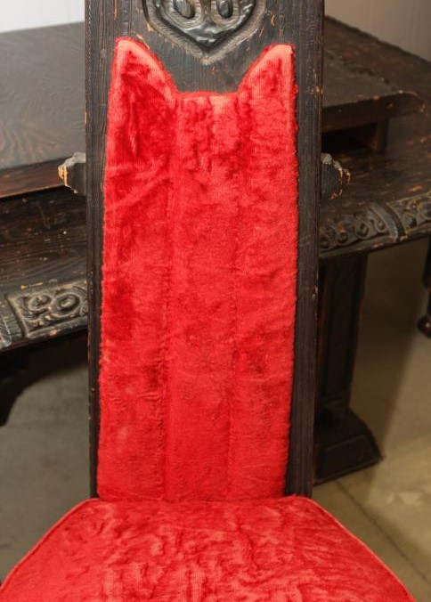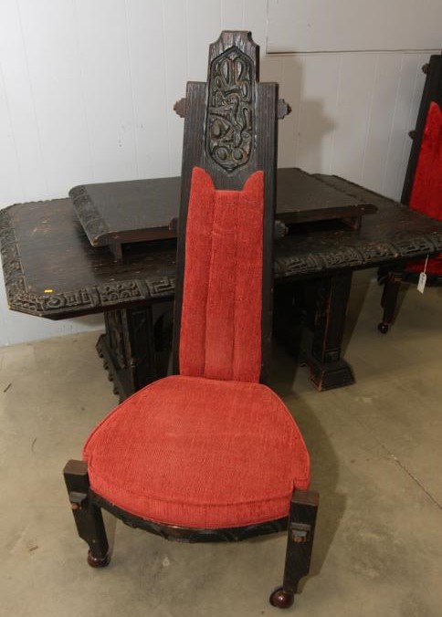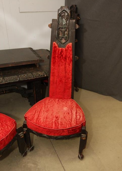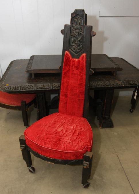 Heavily carved expandable dining room table 67" X 42" X 31"T with one 24" leaf, having four matching side chairs with red uph on casters having carved backs, owner reports of Spanish origin. Pickup only.