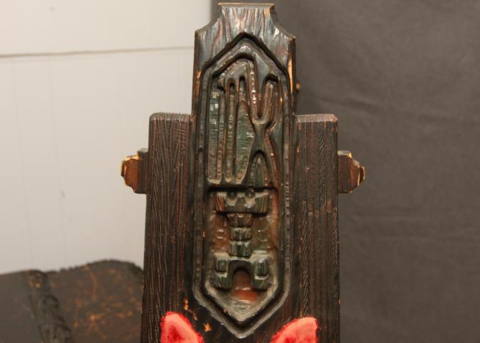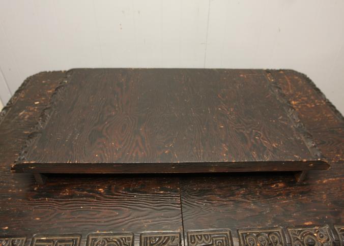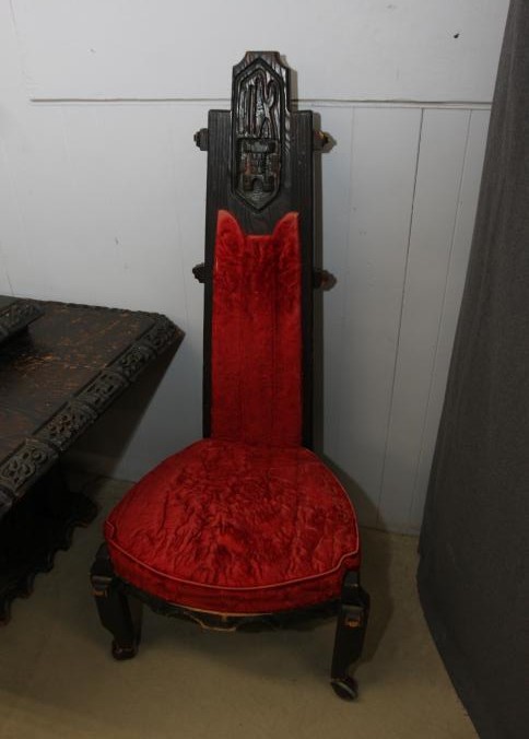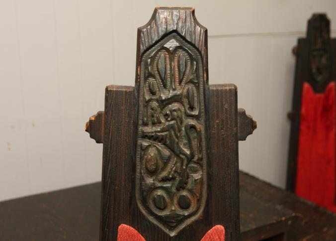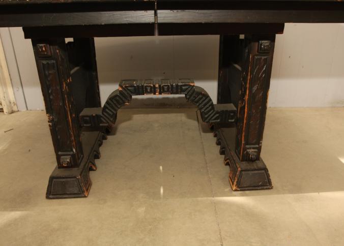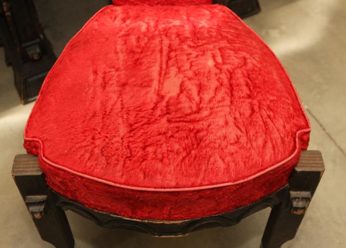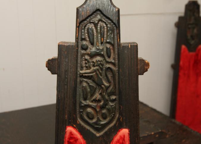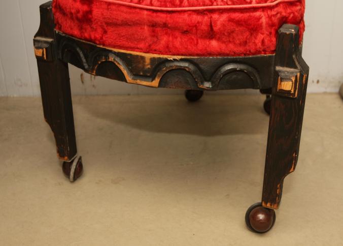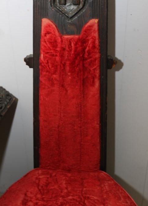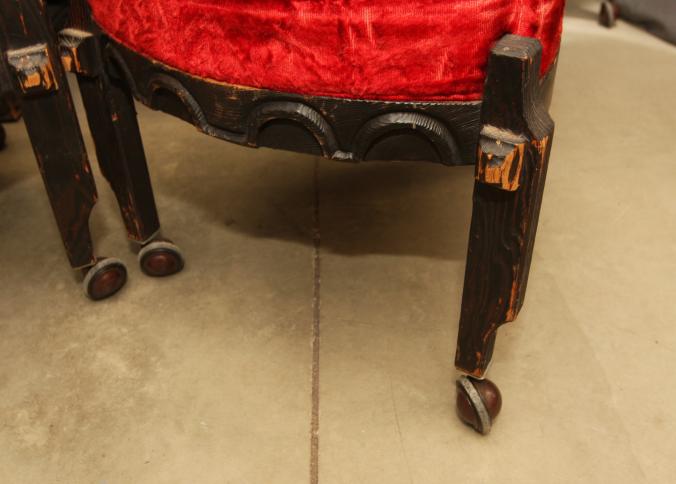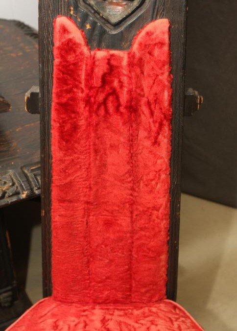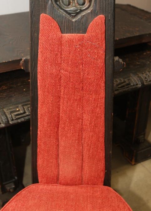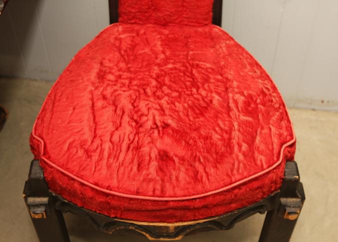 Heavily carved expandable dining room table 67" X 42" X 31"T with one 24" leaf, having four matching side chairs with red uph on casters having carved backs, owner reports of Spanish origin. Pickup only.