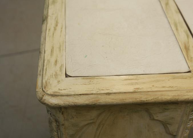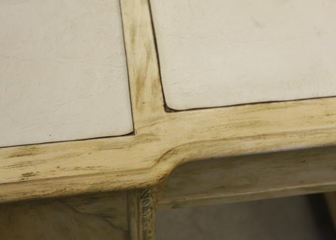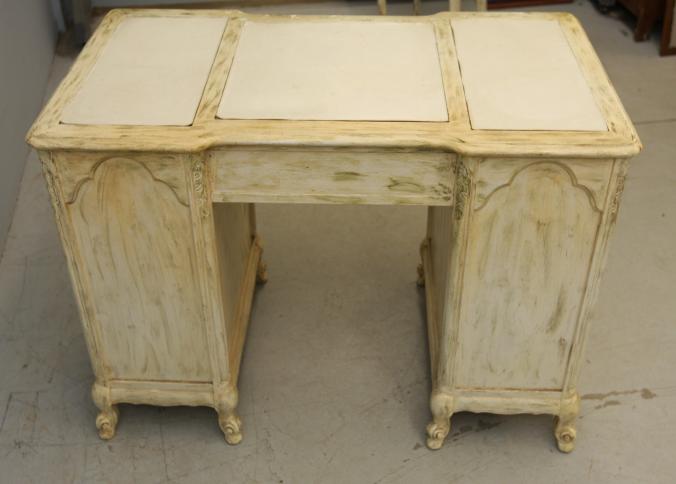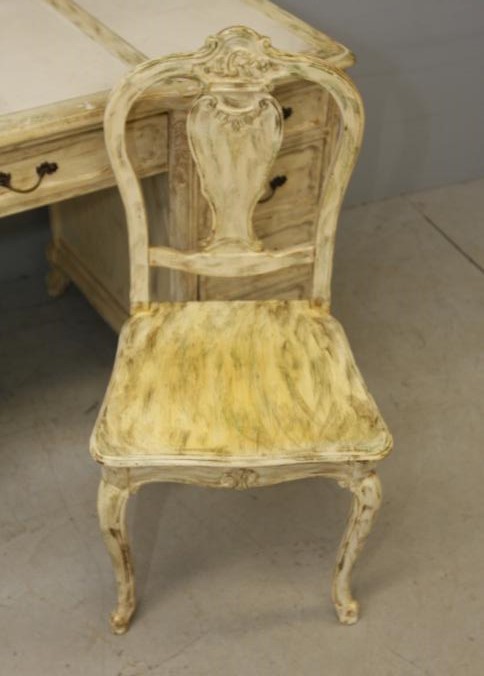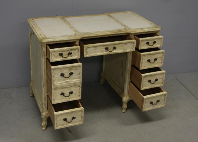 Eight drawer knee hole desk with three section leather top having all matching metal pulls and dovetail construction 44" X 23" X 30.5"T, with side chair. Pickup only.