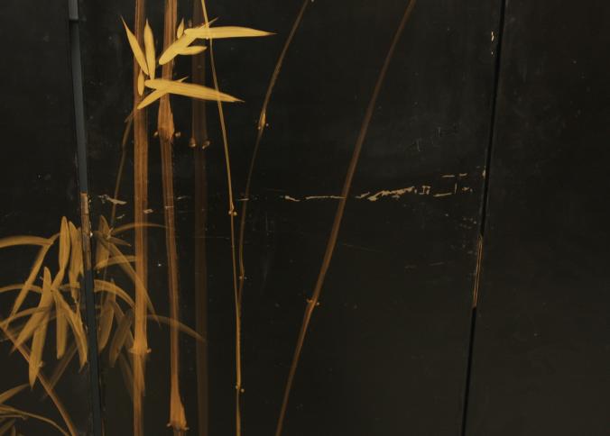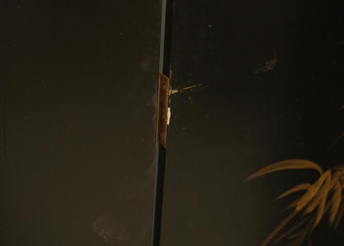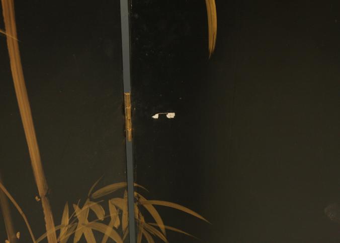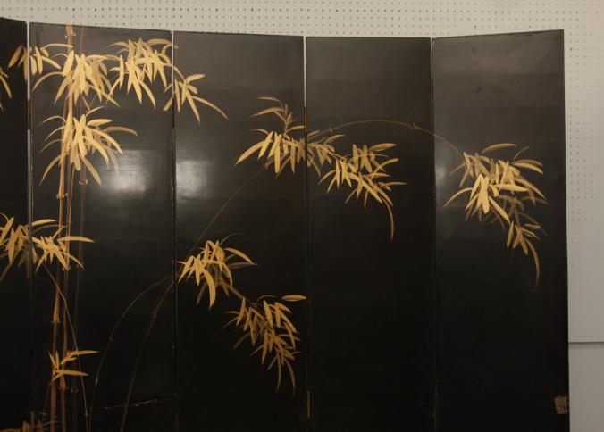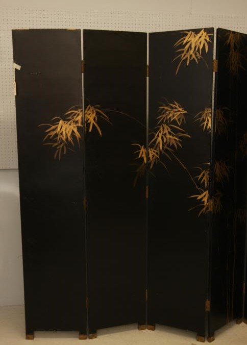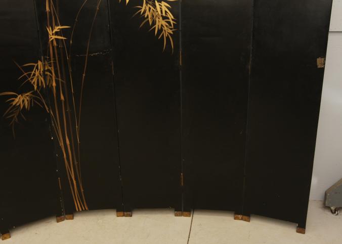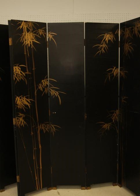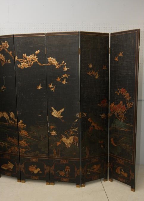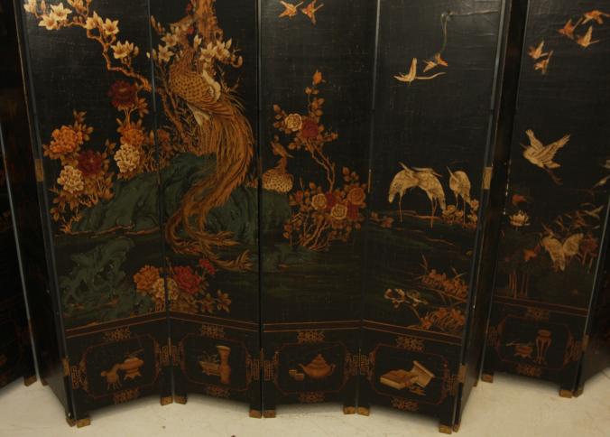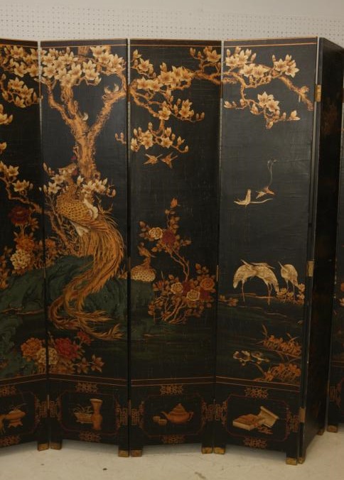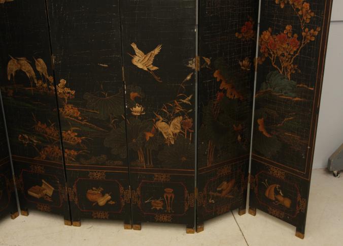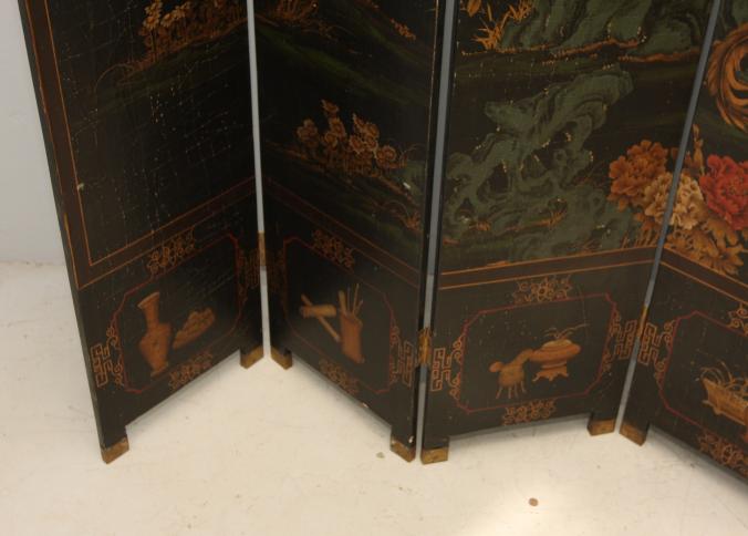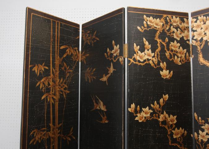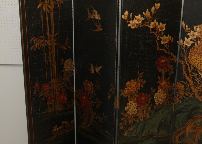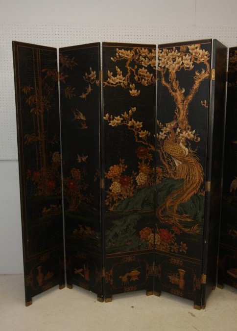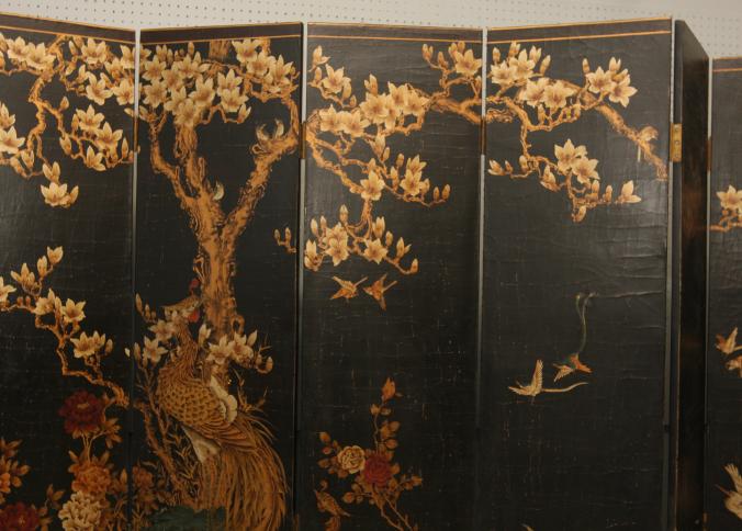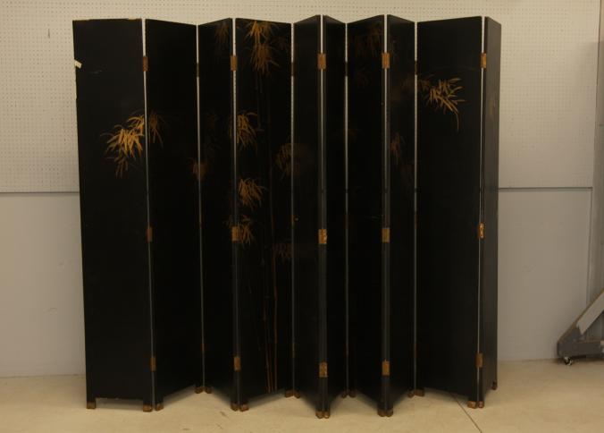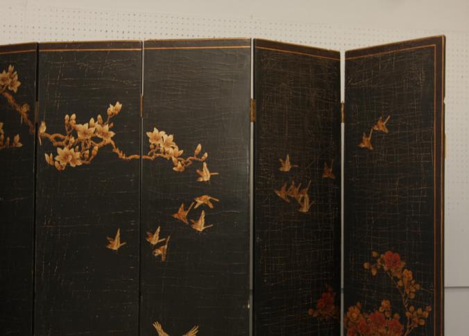 Ten panel folding screen one side having floral decoration other side having bird and floral decoration, each panel measuring 16" X 83.5"T. Pickup only.