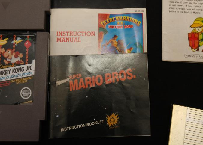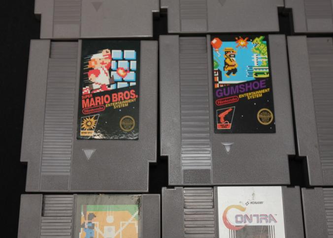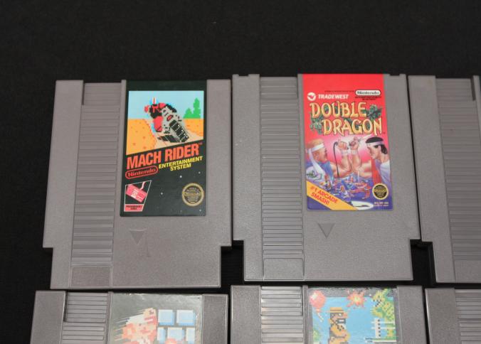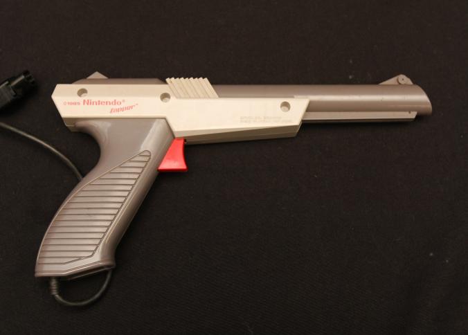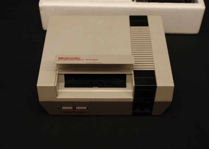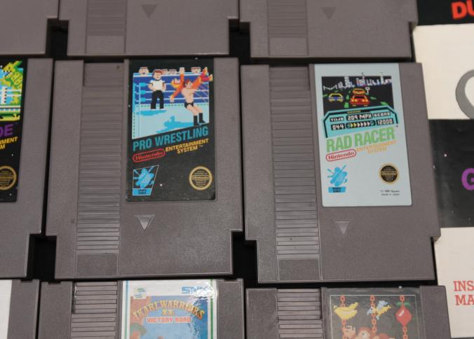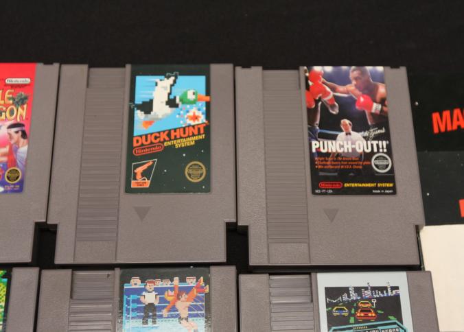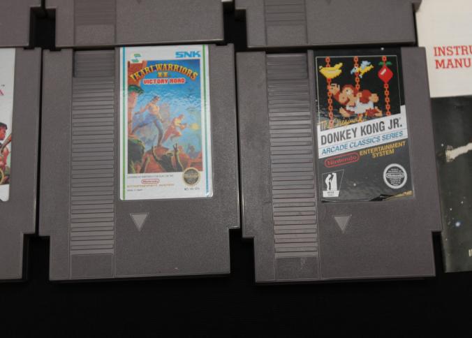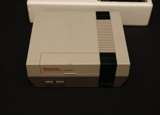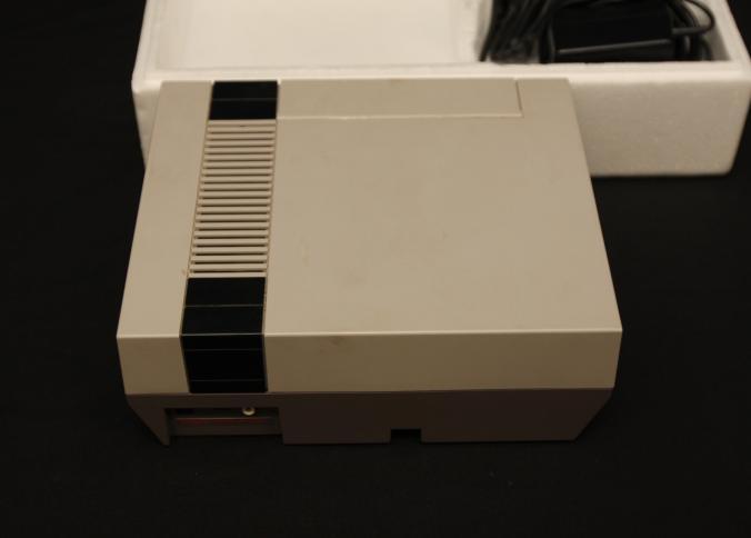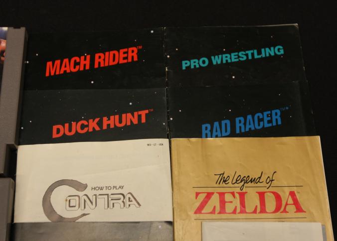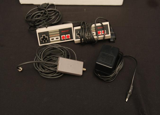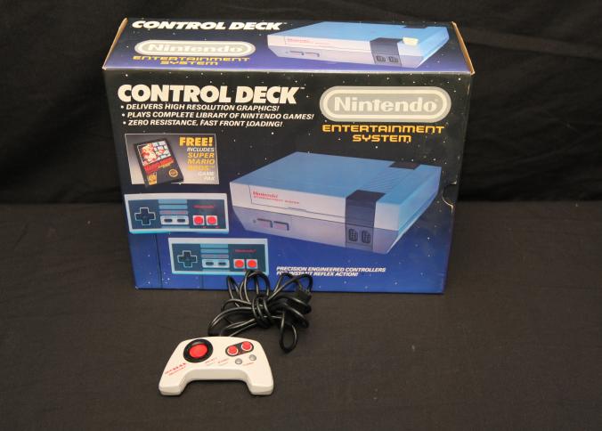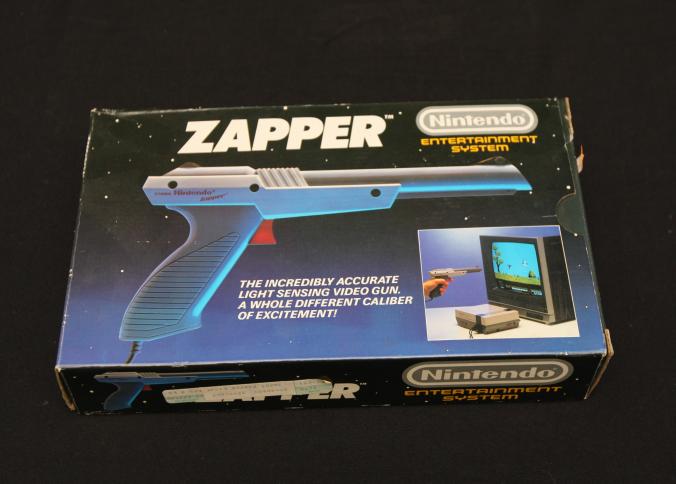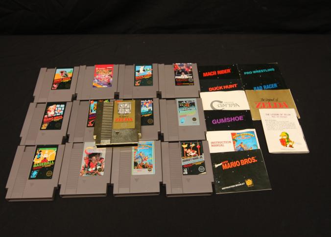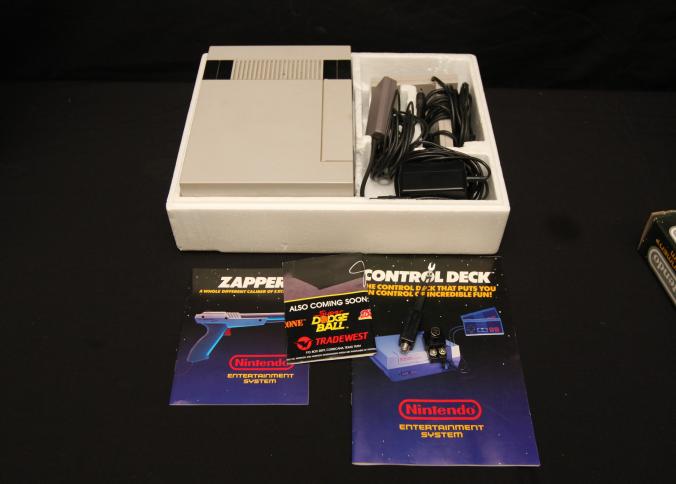 Nintendo entertainment system in original box incl Zapper, Quickshot XII deluxe joystick controller, games incl The Legend of Zelda, Super Mario Bros., Donkey Kong Jr. Duck Hunt, Mach Rider, Rad Racer, Contra, etc.