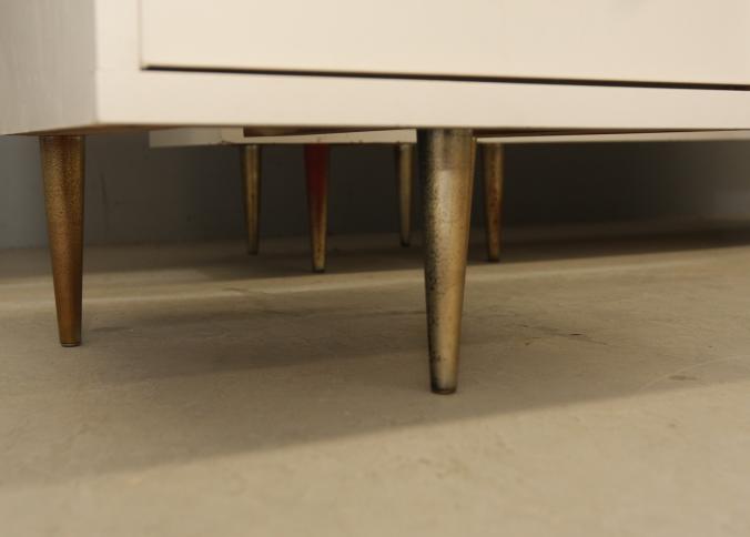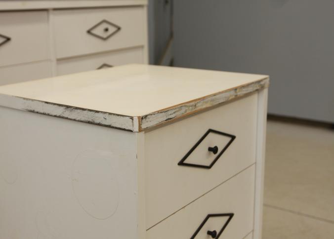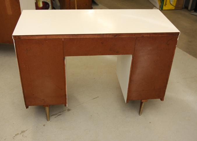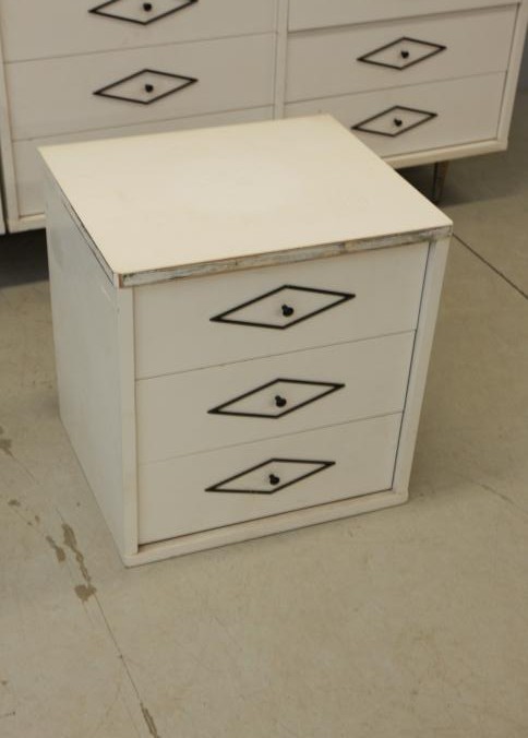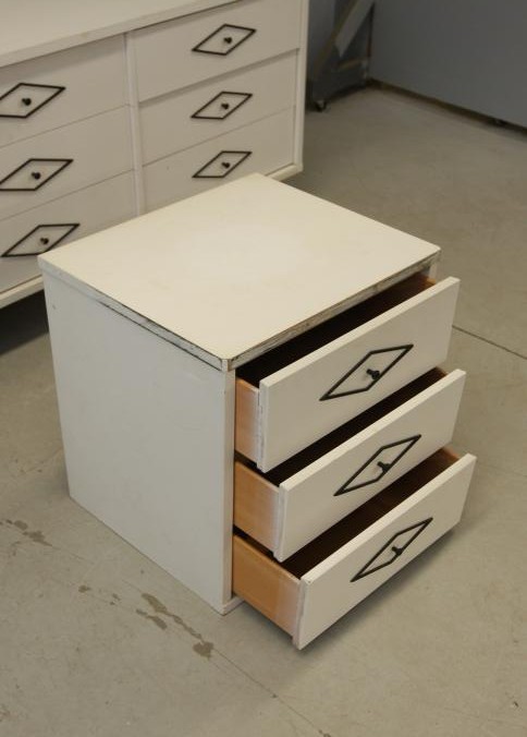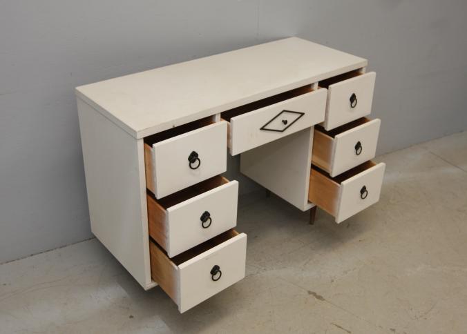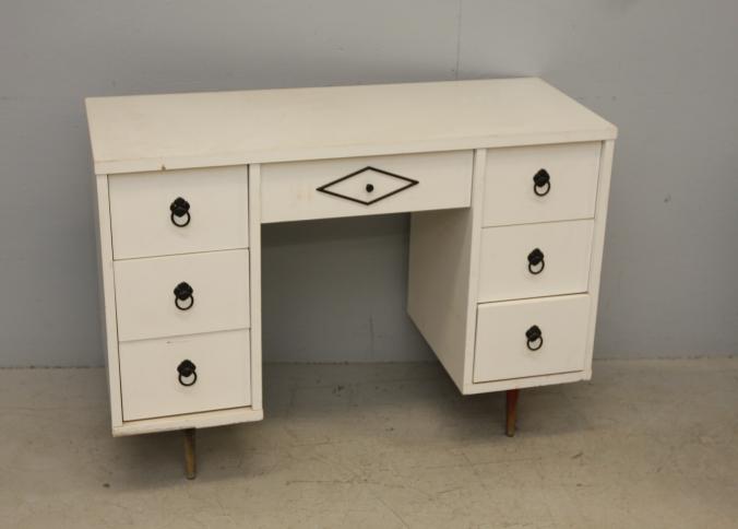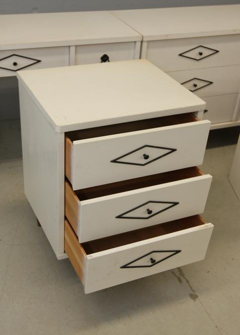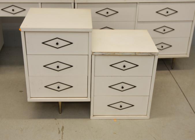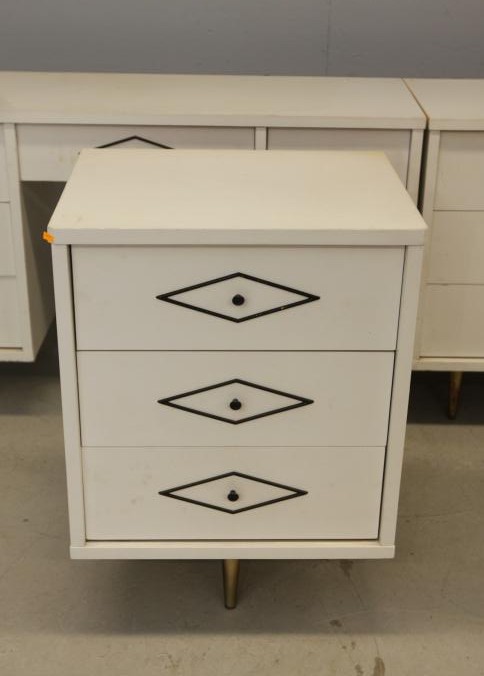 seven drawer knee hole desk on metal feet with dovetailed construction and metal pulls 46" X 18" X 31"T, pair of three drawer nightstands one on metal feet 21" X 18" X 31"T with feet, six drawer dresser on metal feet 50" X 18" X 31"T all having dovetailed construction and matching metal pulls. Pickup only.