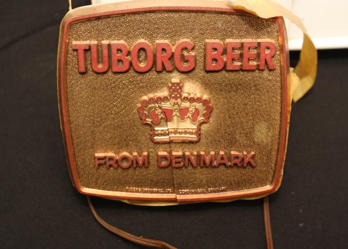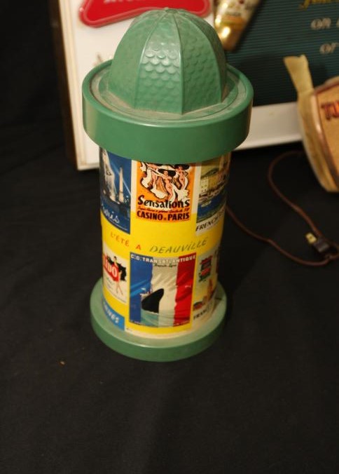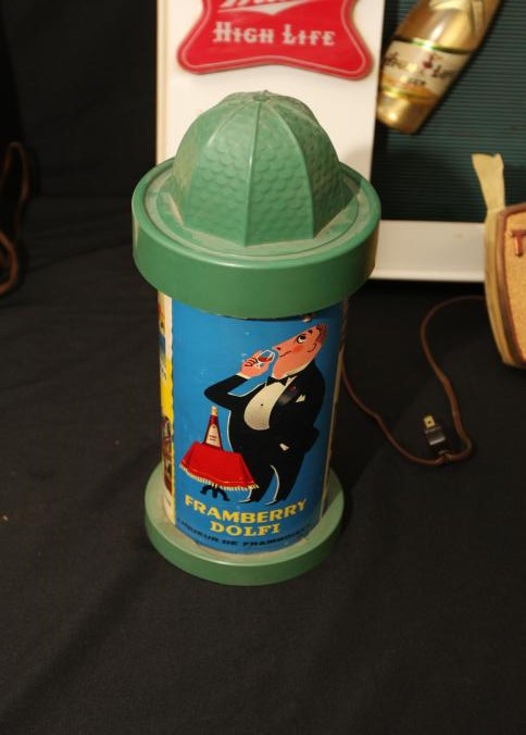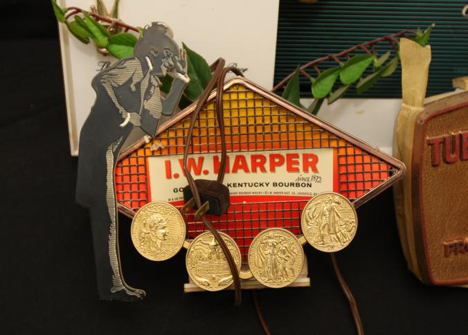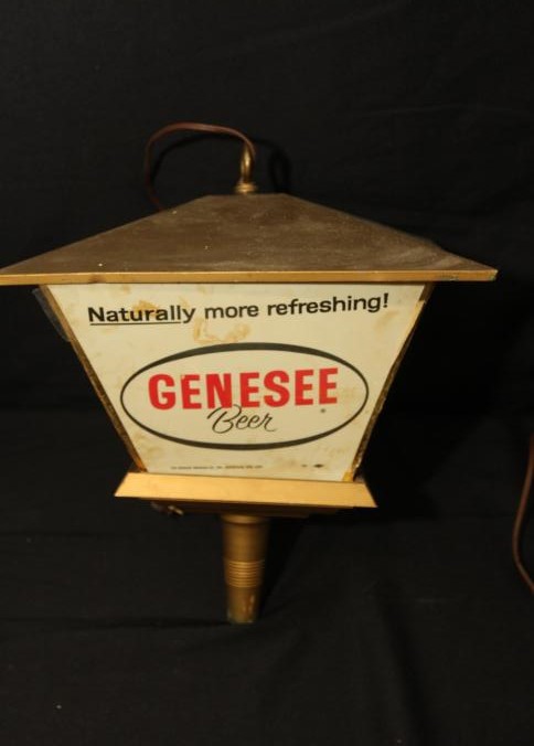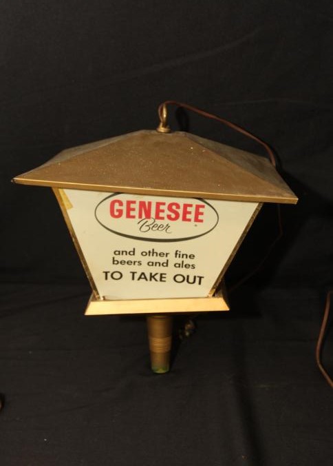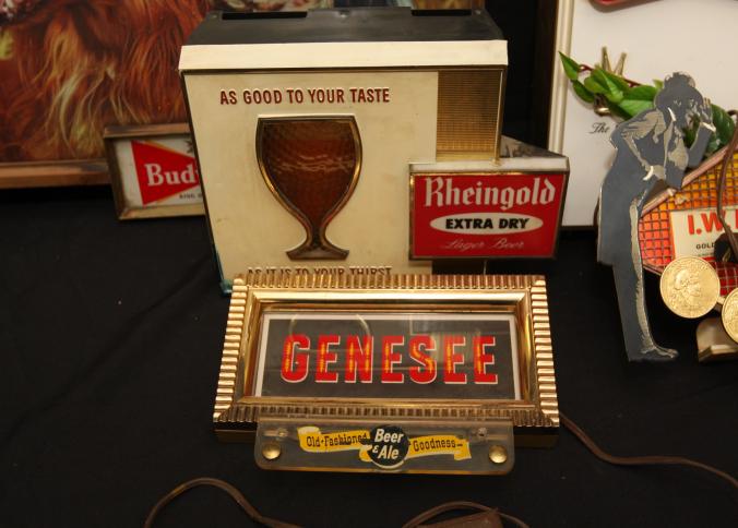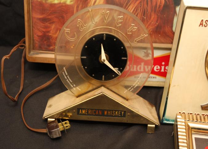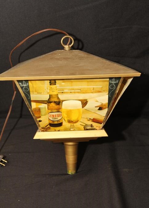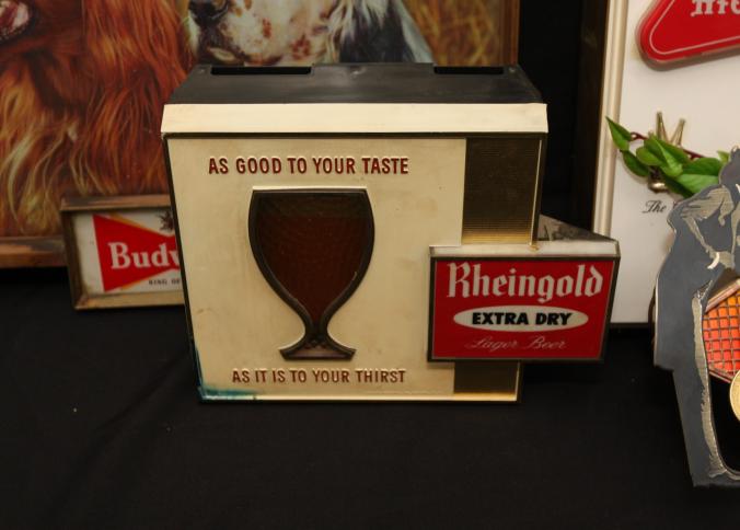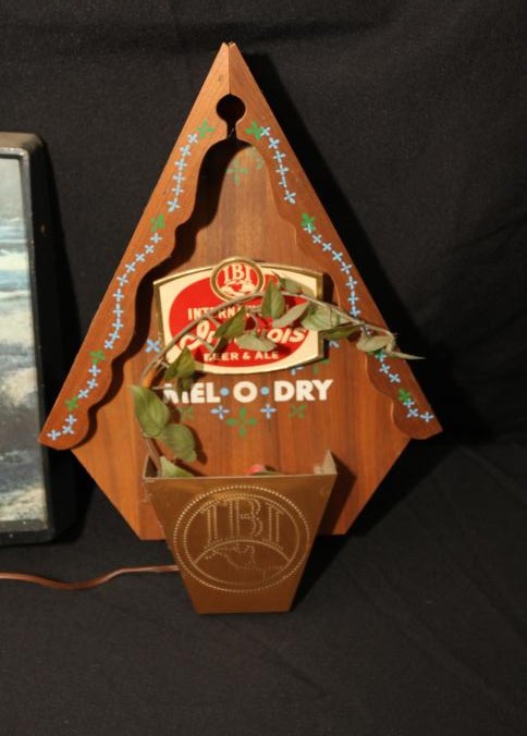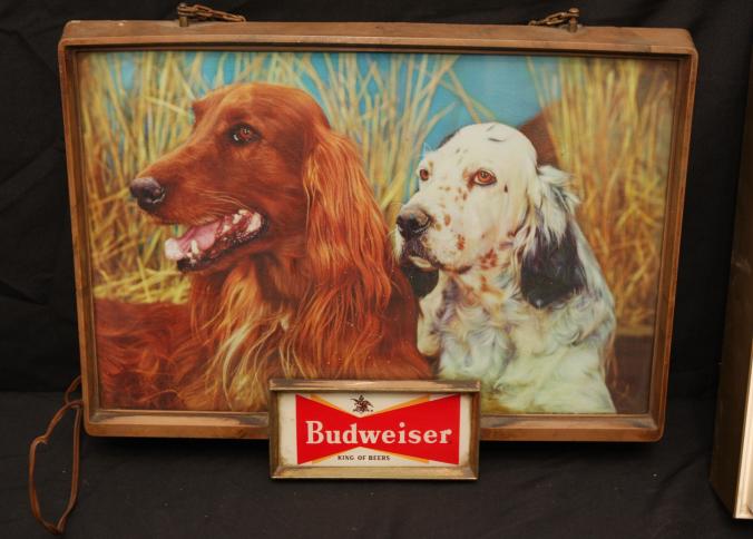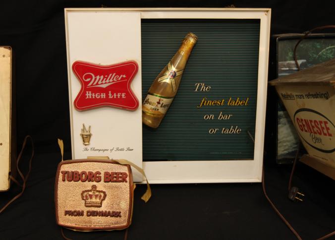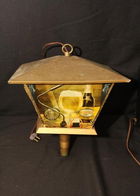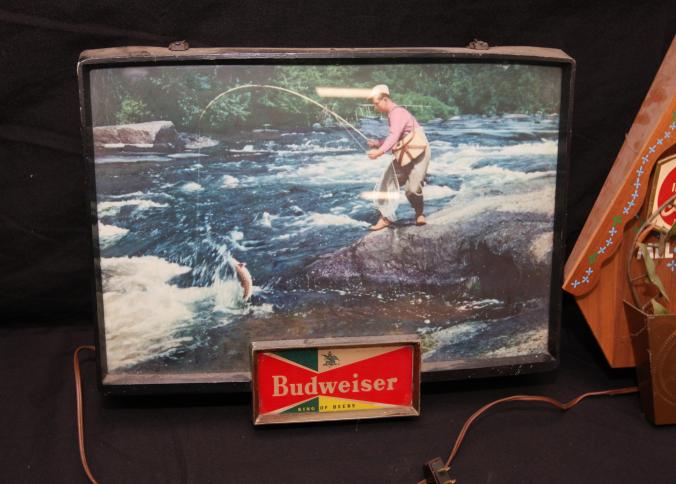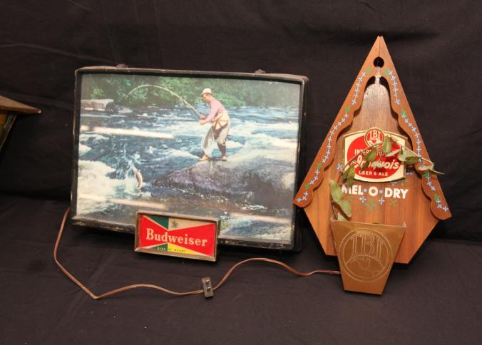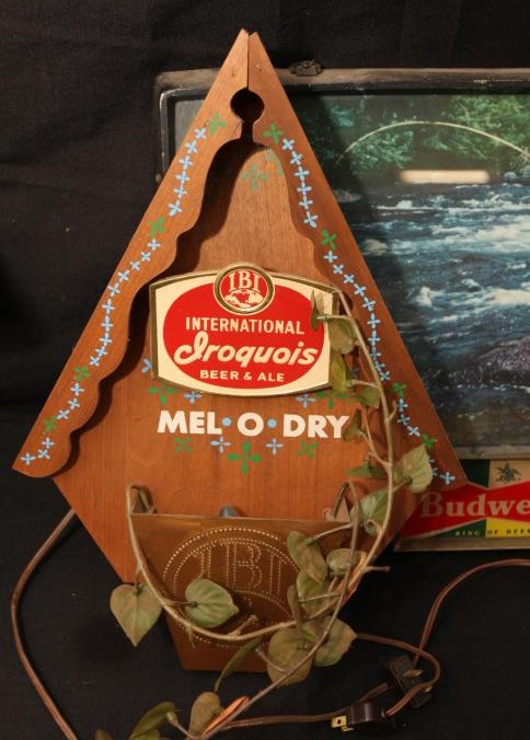 Budweiser dog light, I.W. Harper gold medal Kentucky bourbon light, American whiskey clock/light, Genesee light, moving Miller beer pouring light, Tuborg beer light, Framberry Dolfi wine holder, Rheingold light, Iroquois beer & Ale blinking wooden light, Iroquois beer & ale blinking wooden light, Budweiser fishing light, Genesee spinning light. Pickup only.