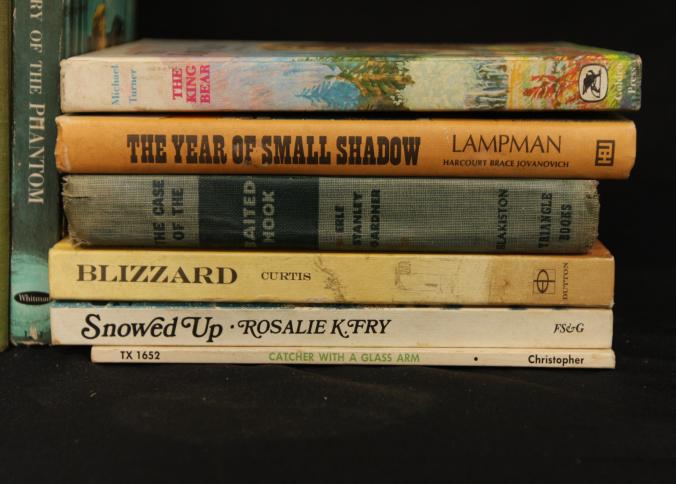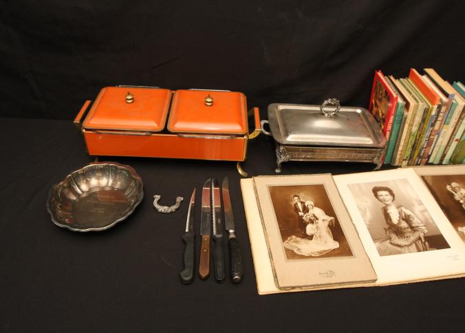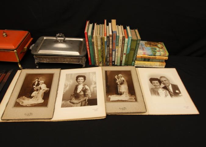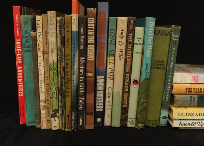 Books incl "Hotel For Dogs", "Run to Daylight", "The Mysterious Bender Bones", "Andy & Willie", "Lone Seal Pup", "Band of Brothers", "Lost in The Desert", "Mystery in Little Tokyo", "True-Life Adventures", "Stevie and His Seven Orphans", etc, also incl silver plate bowl, covered serving dishes, knives. Pickup only.