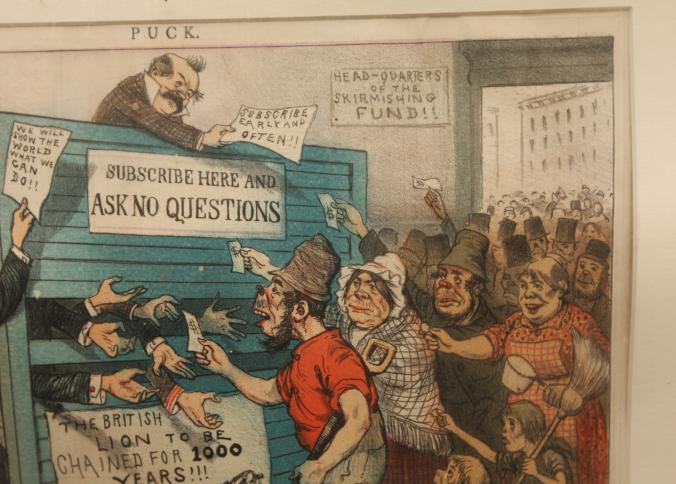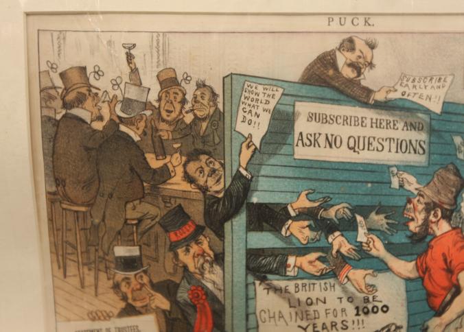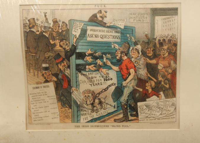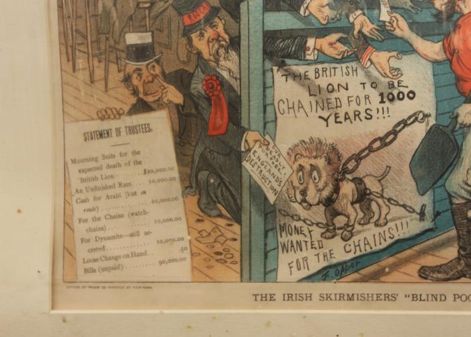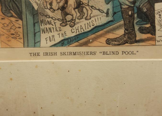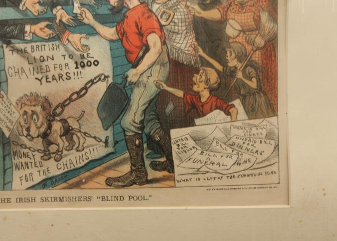 Framed artwork of "The Irish Skirmishers' "Blind Pool" marked "Office of "Puck" 23 Warren ST New York", "Mayer Merkel & Ottoman. Lith. 23-25 Warren ST. N.Y." 20" X 16".
