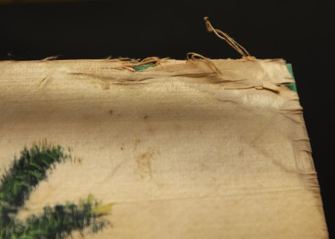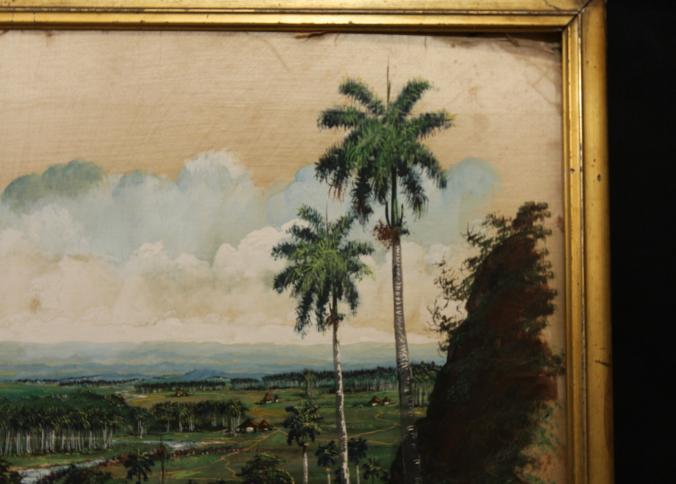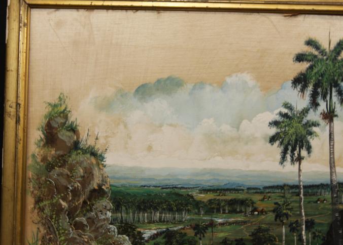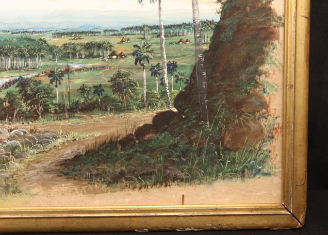 Framed artwork of landscape scene with palm trees, rock formations, etc. 18.5" X 15.5".