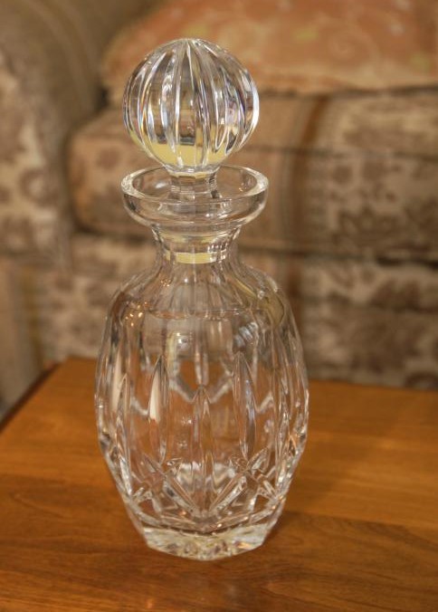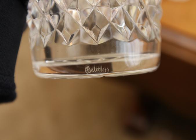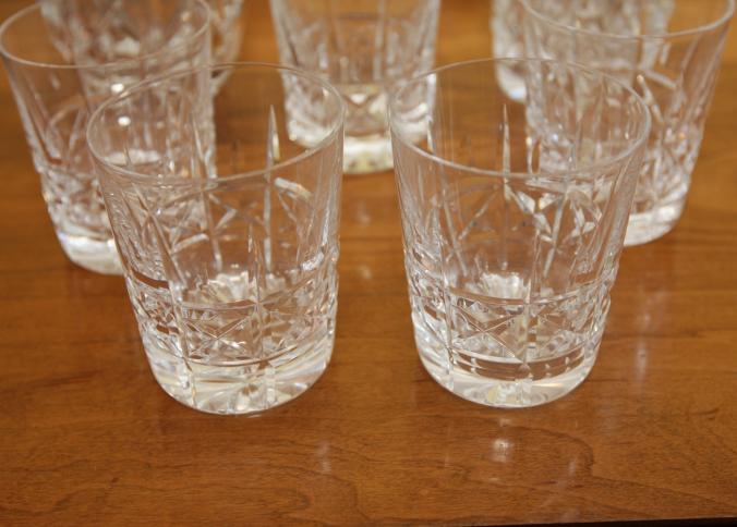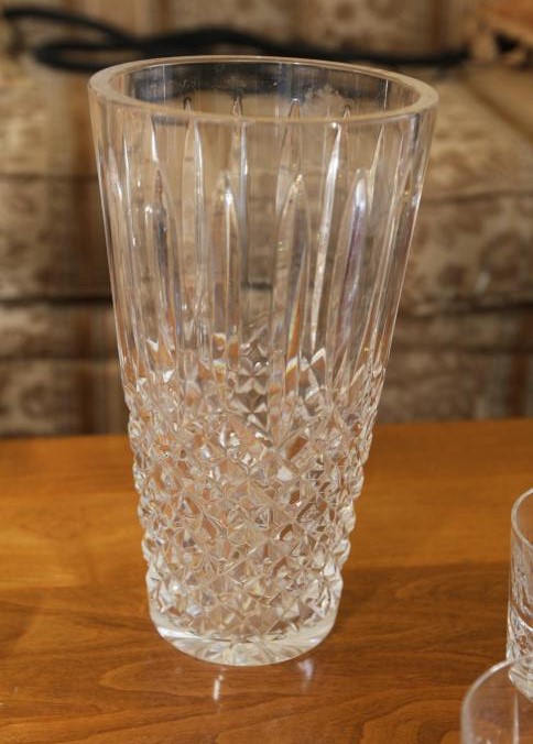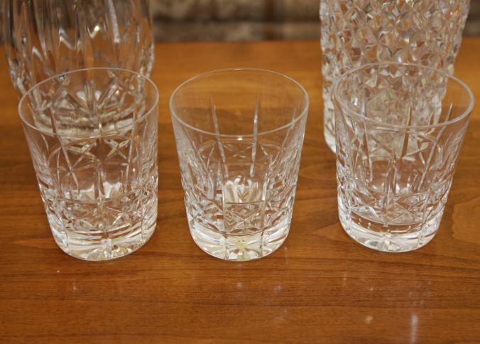 Waterford crystal incl decanter 11" tall, vase 10" tall, five cups each being 3.5" tall.