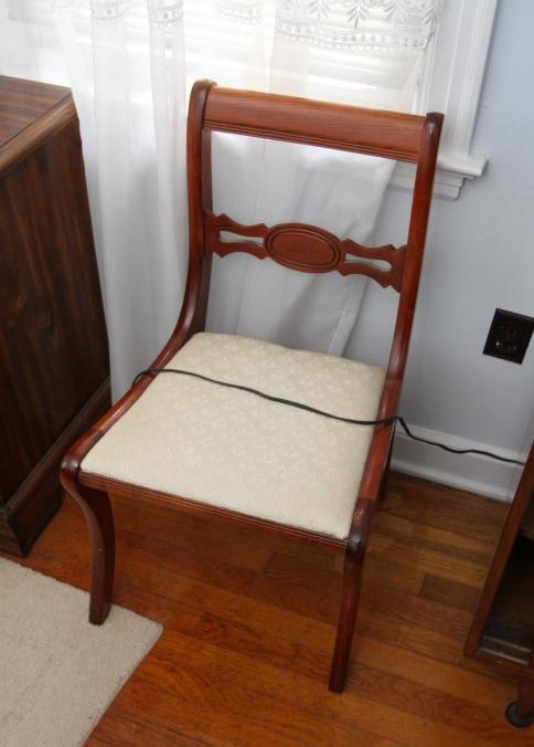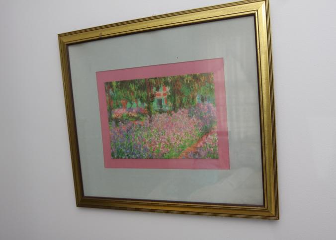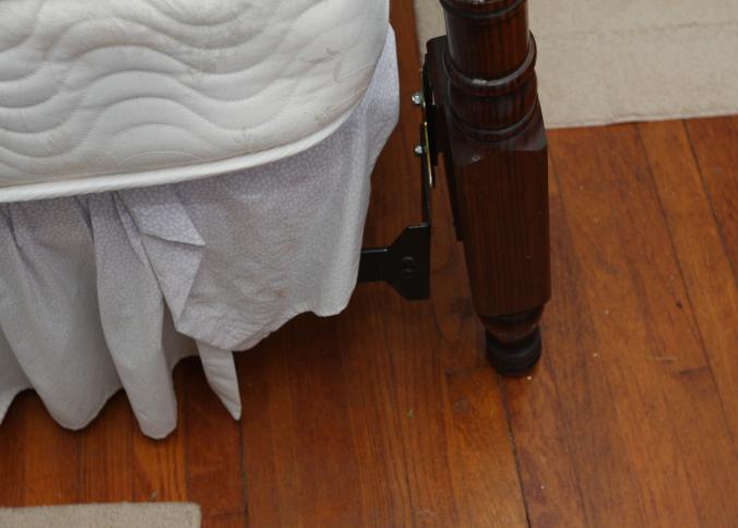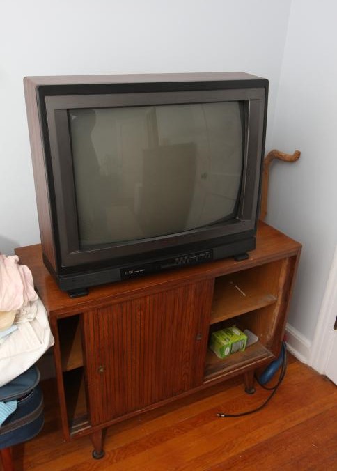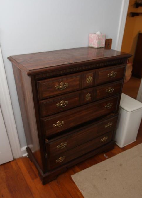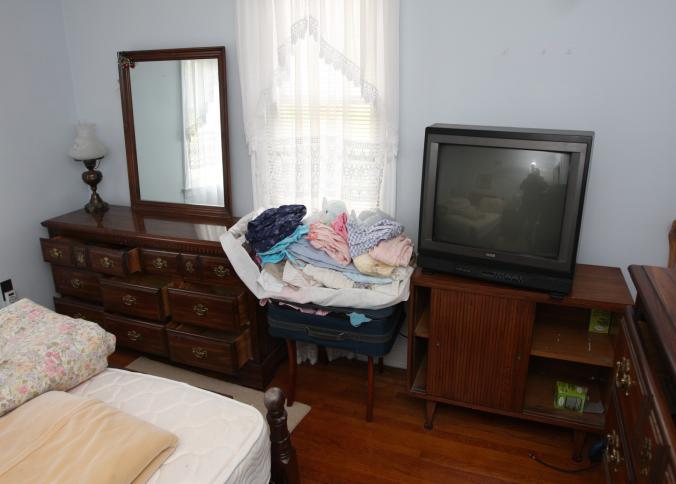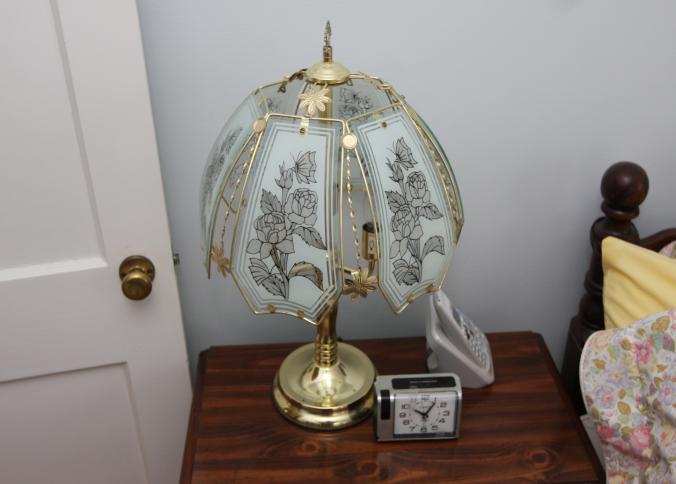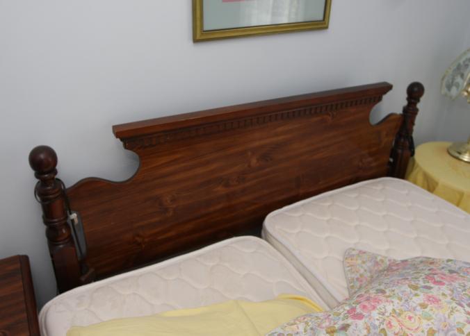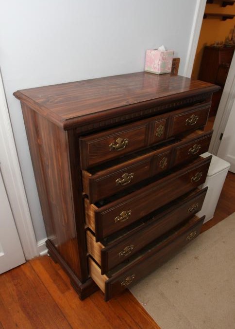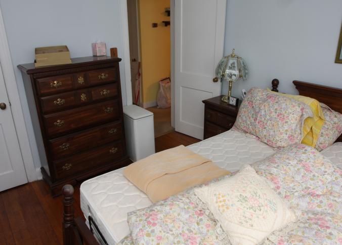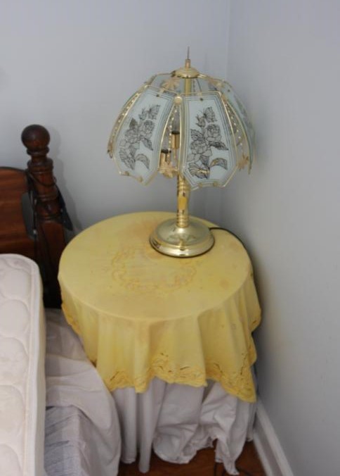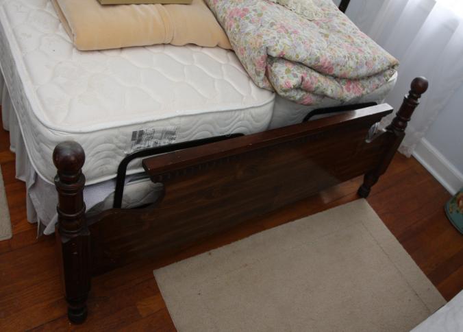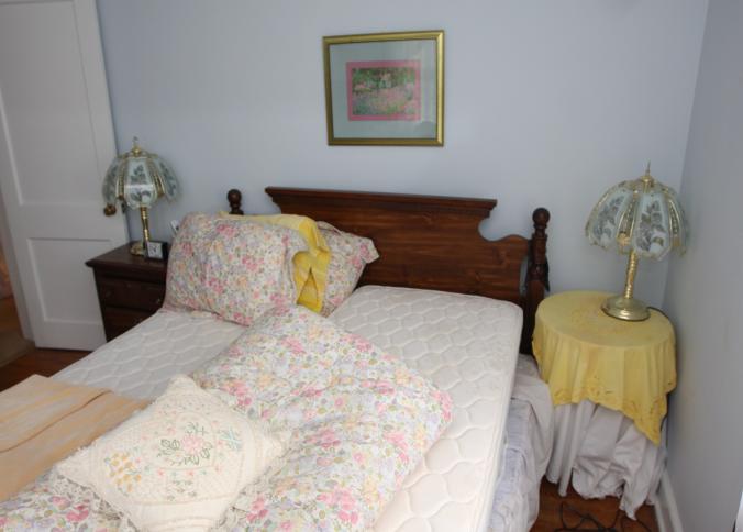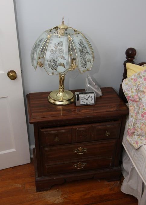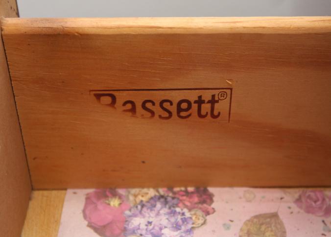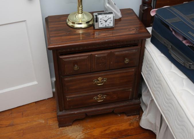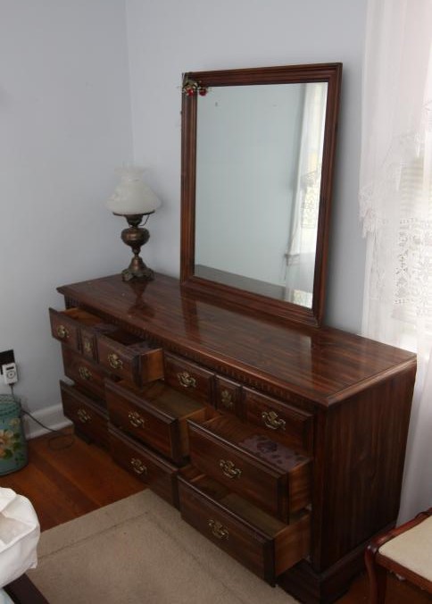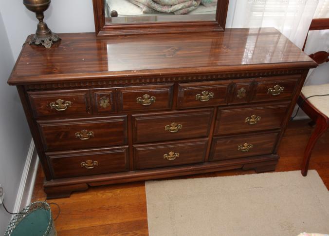 Bedroom furniture, believed to be Bassett, and contents of room incl long mirrored back dresser with eight drawers marked Bassett 60" x 18" x 31", five drawer chest of drawers unmarked 36" x 18" x 47.5", two drawer night stand unmarked 25" x 14" x 27", head board and foot board unmarked 62.5" long, oil converted to electric table lamp, touch sensitive table lamps, RCA 26" TV XL 100, Timex clock, chair, round night stand, TV stand 36" x 16" x 29", artwork, etc.