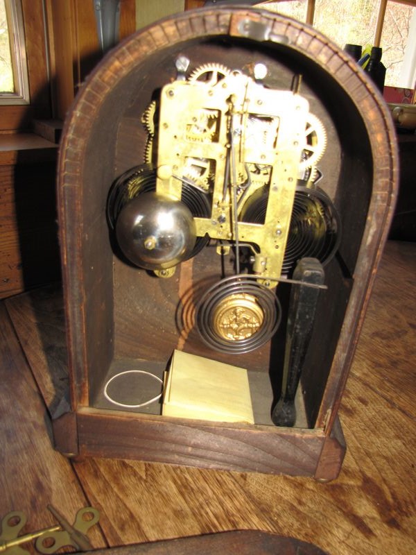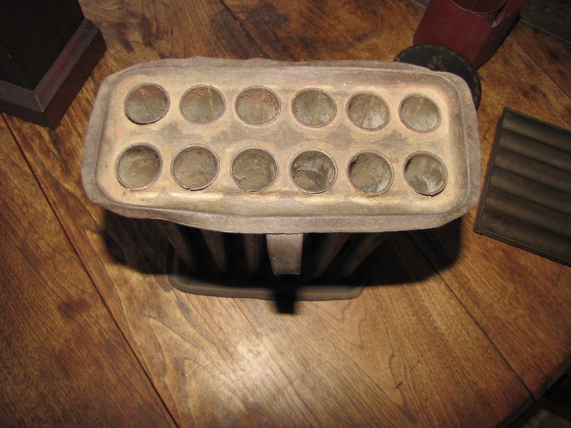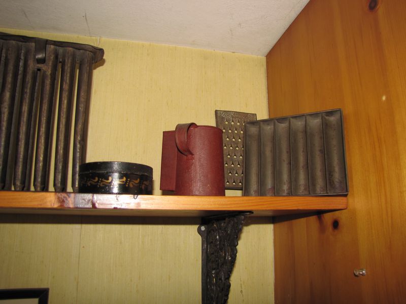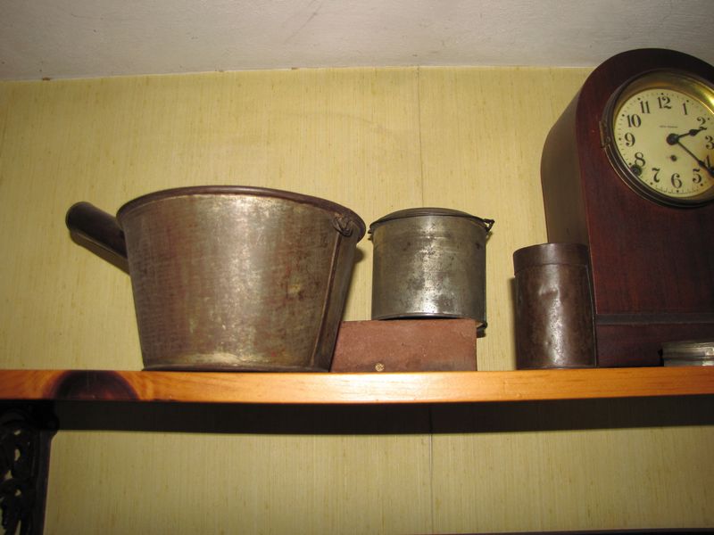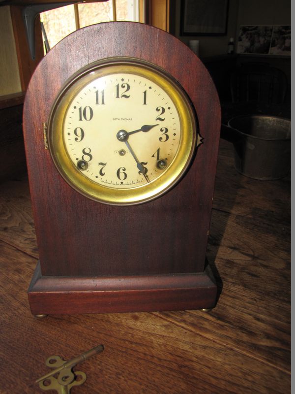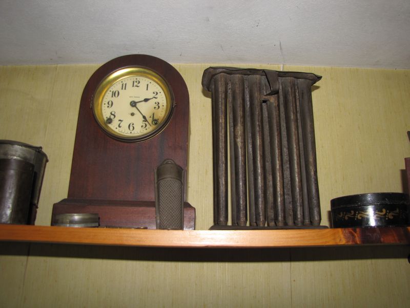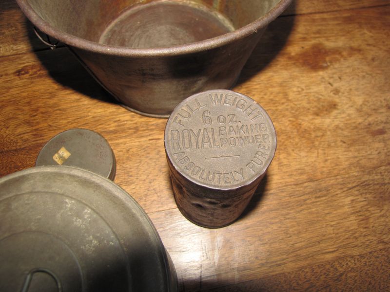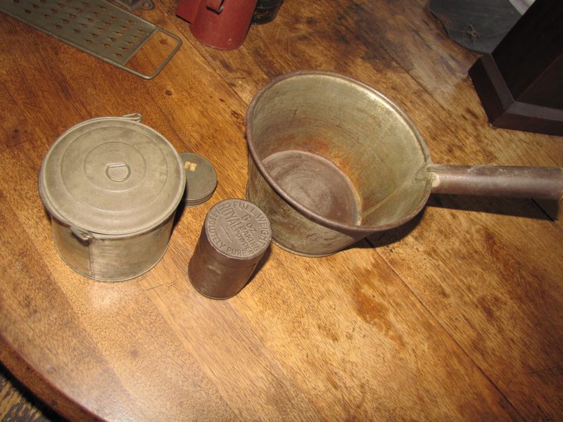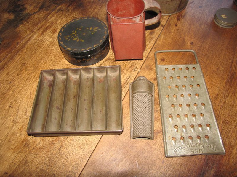 Vintage tinware including 12-candle mold, 2 graters, tole box with lid, large dipper, Royal 6 oz. baking powder tin with lid. Lot also includes Seth Thomas shelf clock & clock keys, appears to be functional, note indicates it was serviced in 1990.