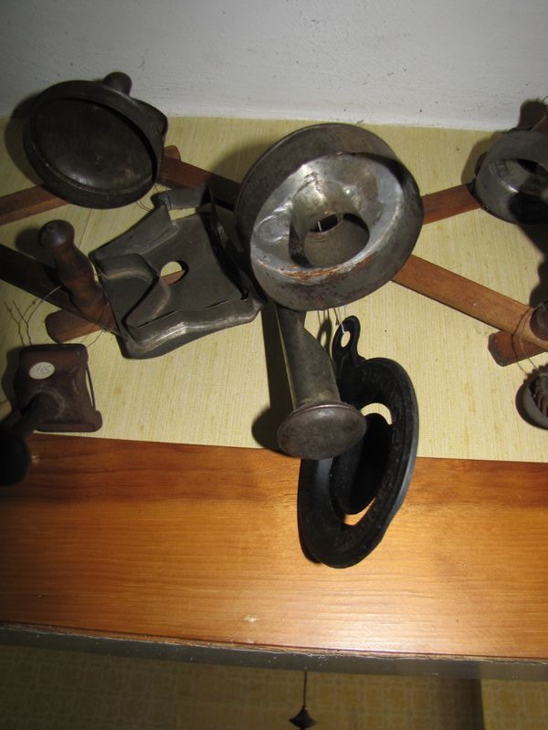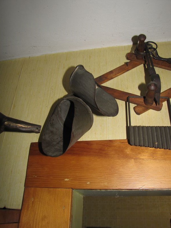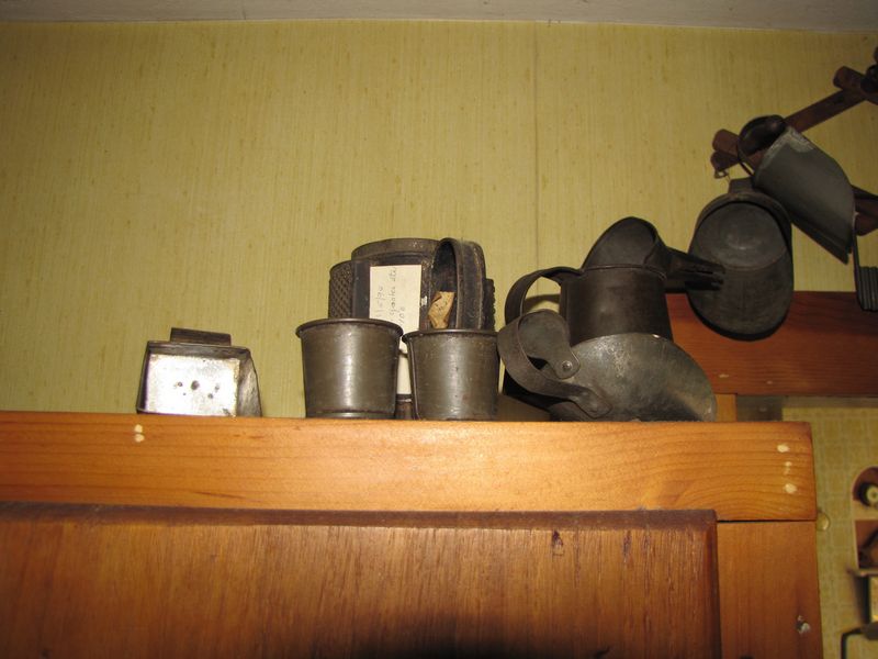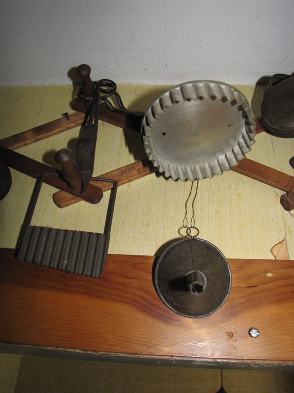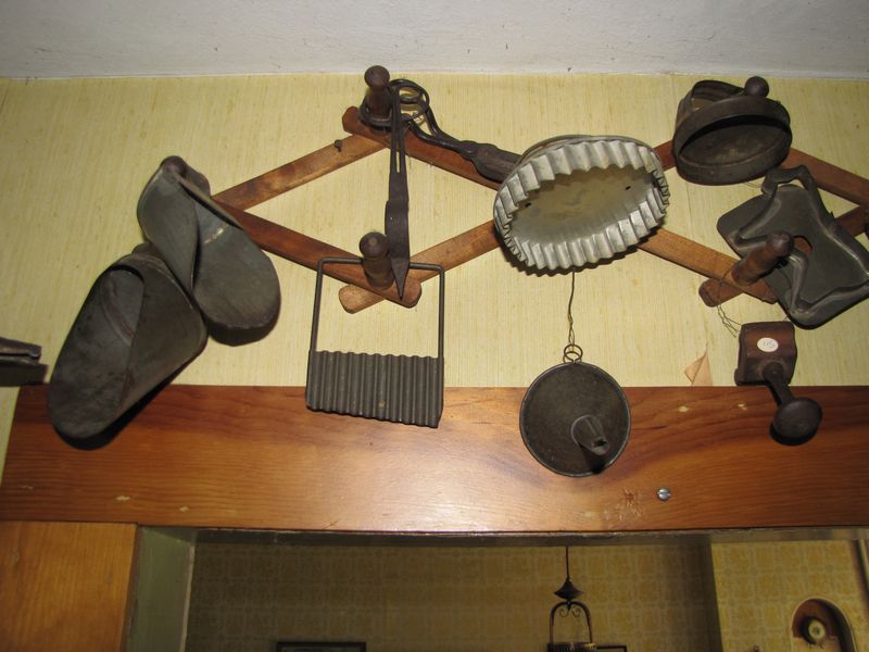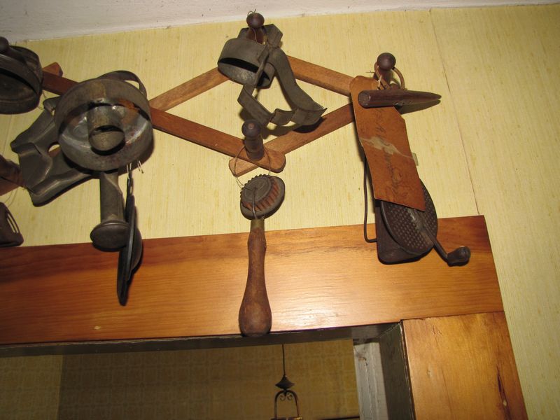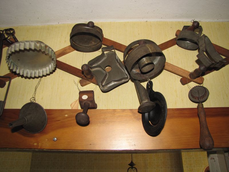 Antique and vintage small tin kitchenware items including biscuit cutters, scoops, funnels, cups, egg separator, etc. Wooden hanging rack is not included.
