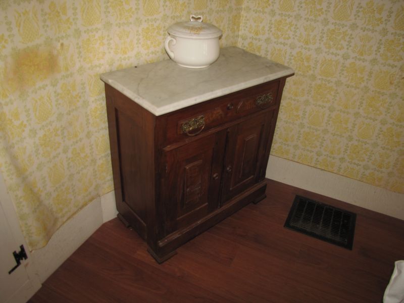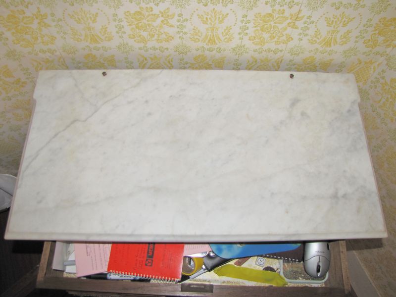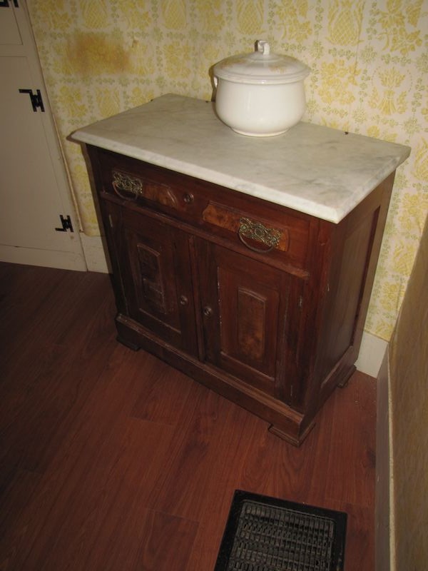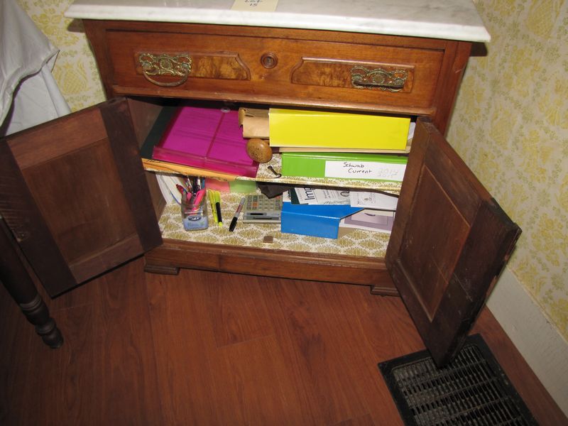 Victorian walnut washstand with a marble top, 31"Tx29.5"Wx15.25"D ,has single drawer and cabinet with shelf, (contents not included). One door has been repaired. Chamber pot appearing in photos not included.