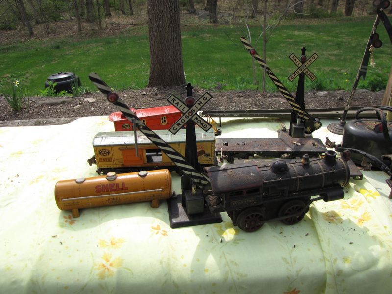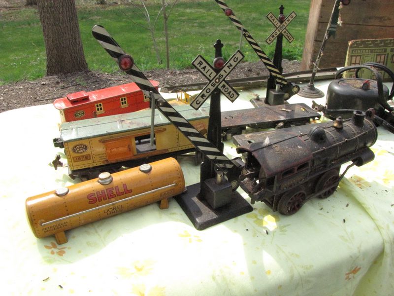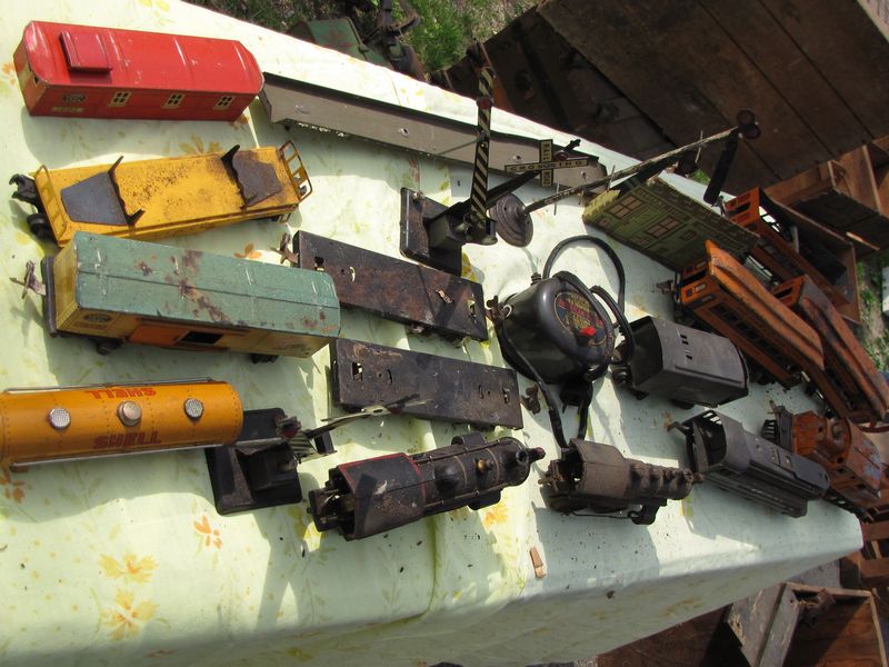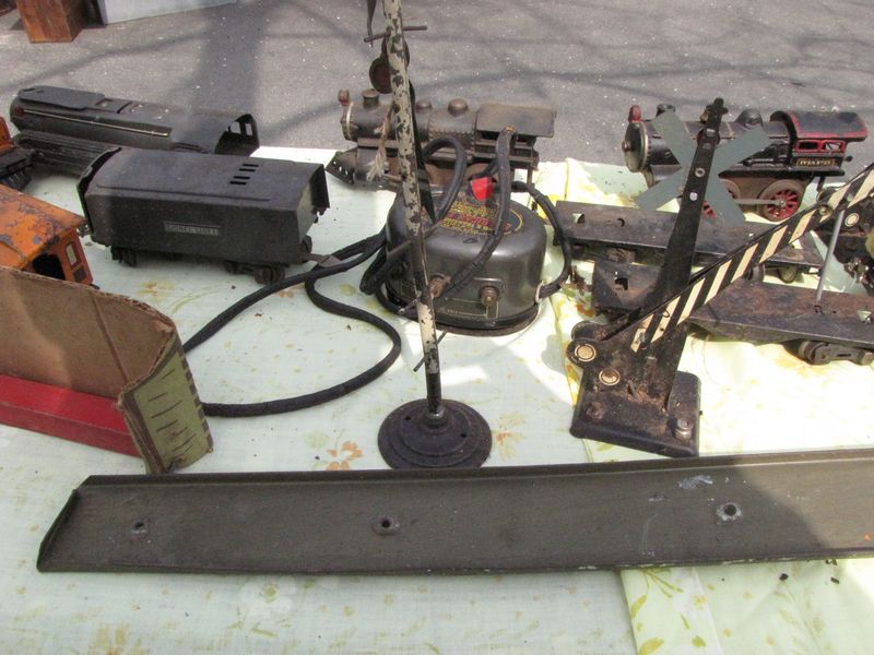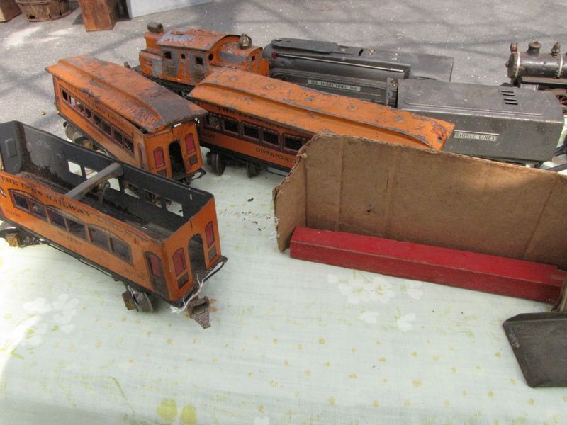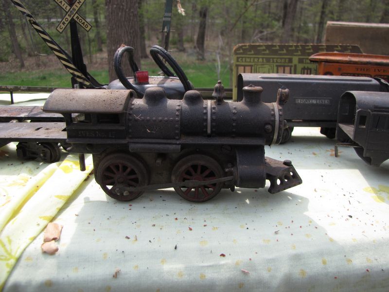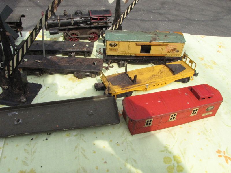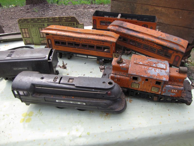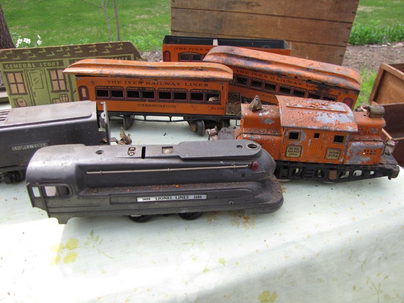Vintage model railroad items including Ives #17 windup engine, Ives #25 windup engine, Ives #3254 electric engine, Lionel 1688 engine, misc. Lionel and Ives train cars, American Flyer transformer, etc. All items are in fair to poor condition with some missing parts. Other items appearing in photo not included.