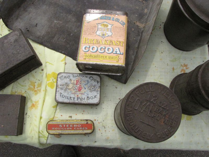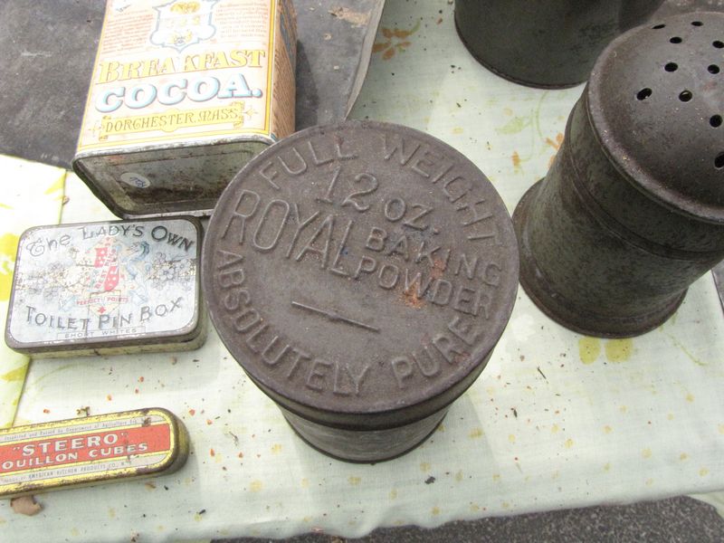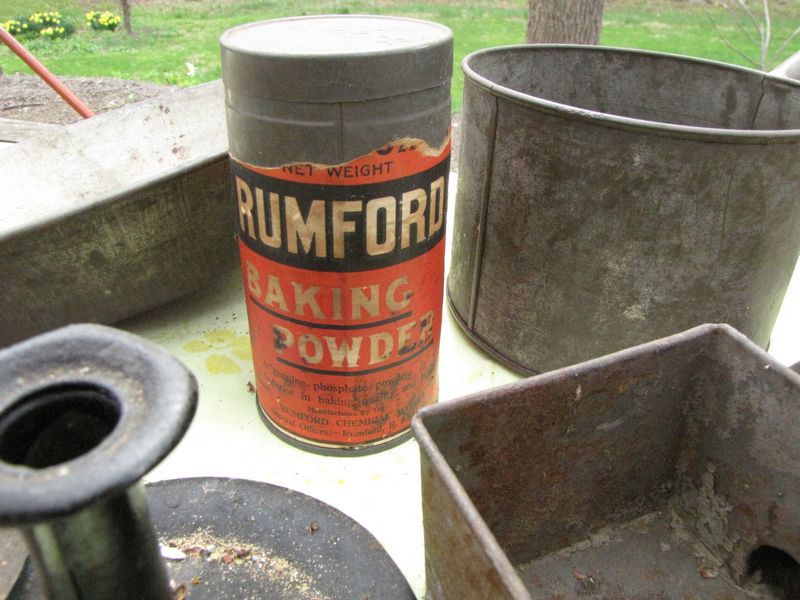 Lot of vintage tinware including numerous advertising pieces such as Walter Baker breakfast cocoa tin, the Ladies Own toilet pin box, Royal Baking Powder, Swifts Silver leaf Brand Lard, National Biscuit Company, Rumford Baking powder plus shaker, lidded tins, sifter, pans, etc.