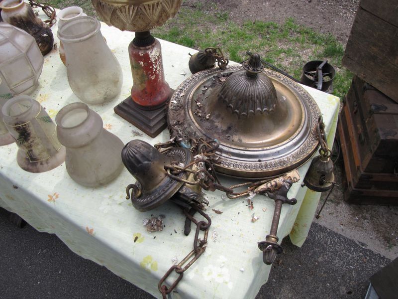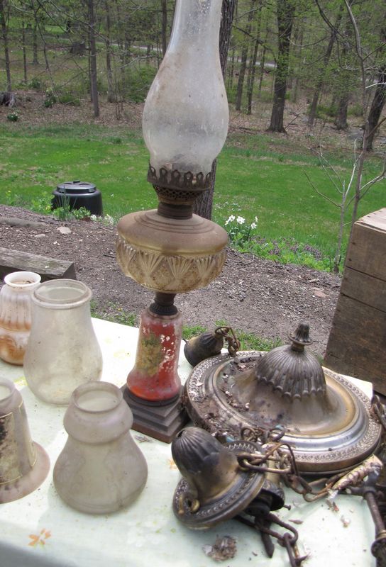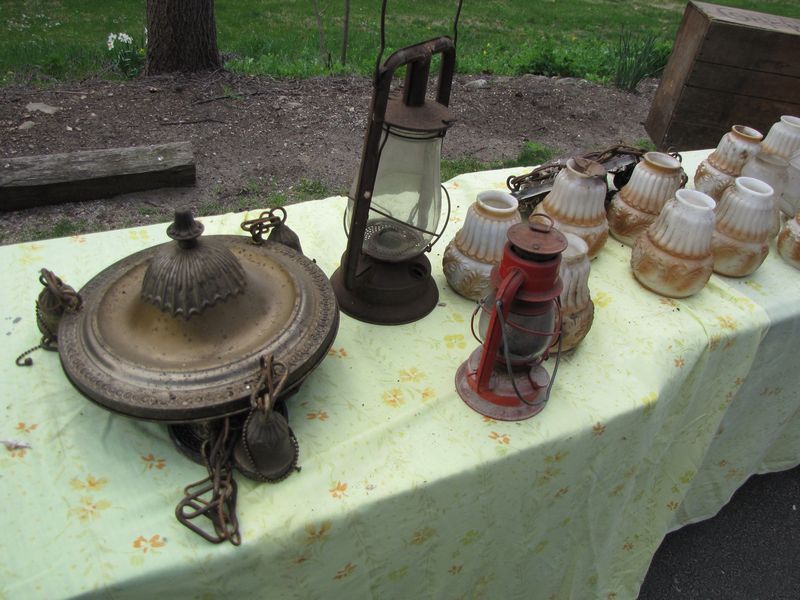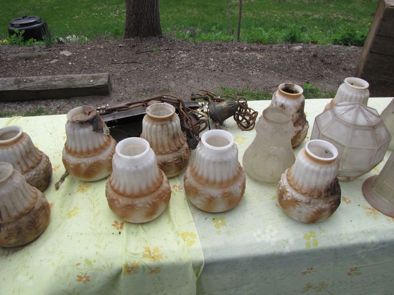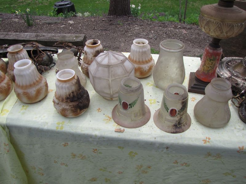 Vintage light fixtures, lanterns, shades, and chimneys. All are dirty from long term barn storage, some may be damaged.