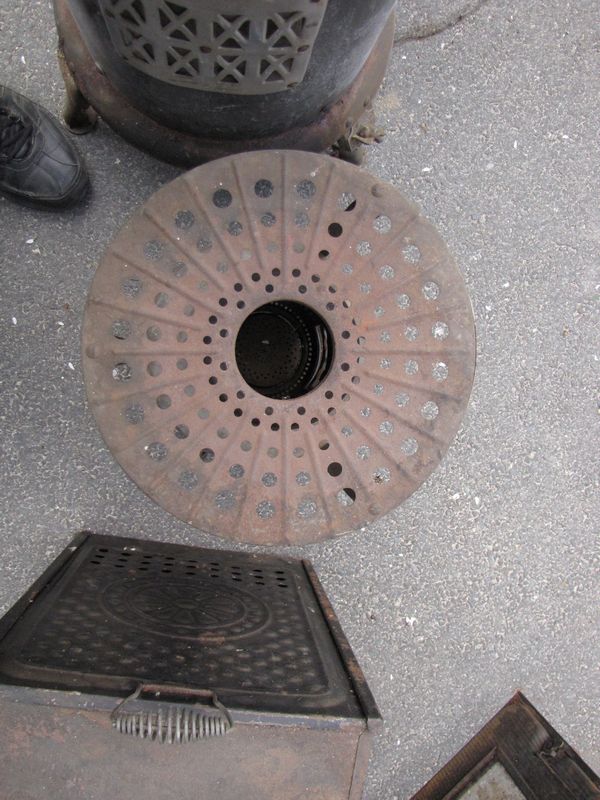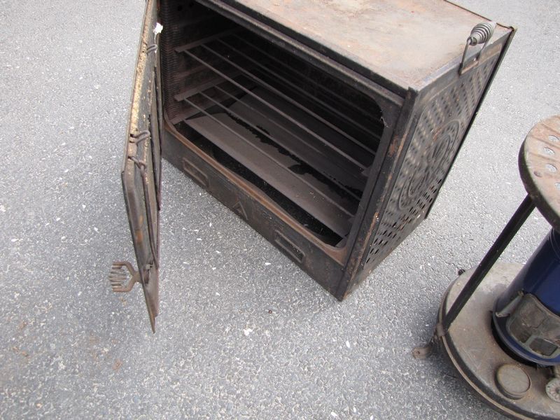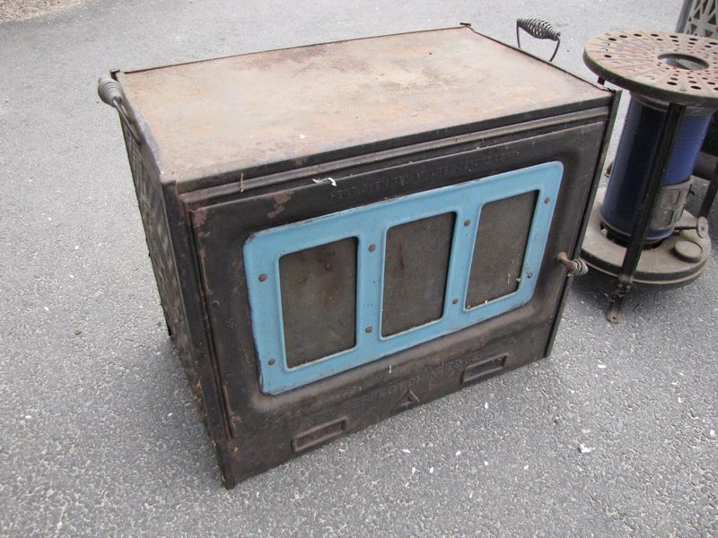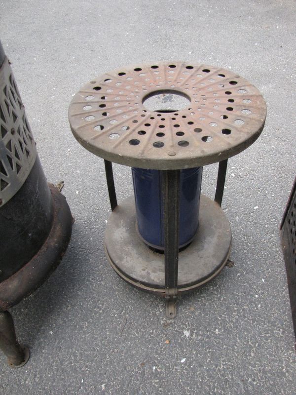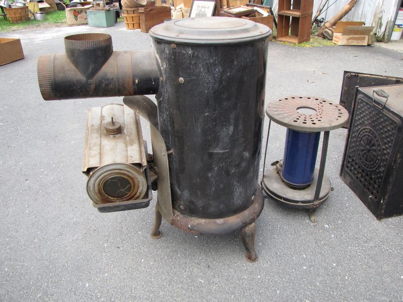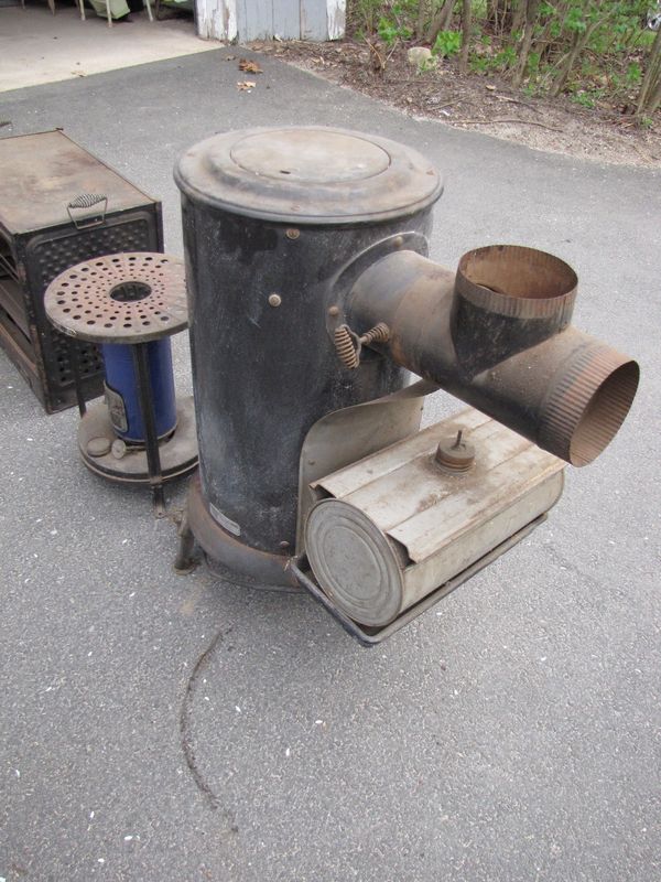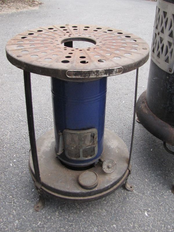 3 vintage tin stoves including New Perfection #122GE, New Perfection 61B with blue chimney, and a Florence Stove Company stove. Functionality unknown.