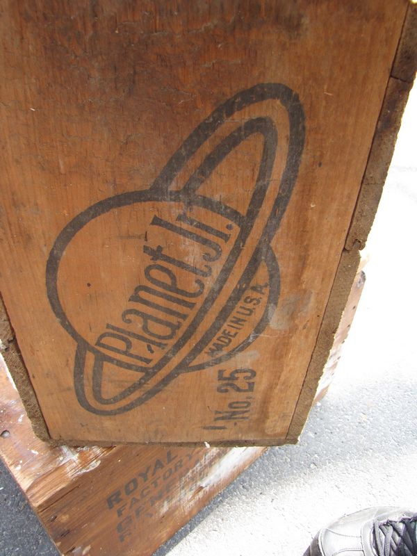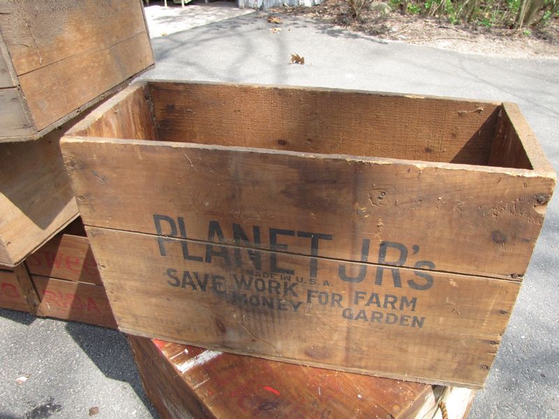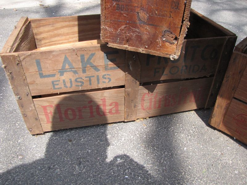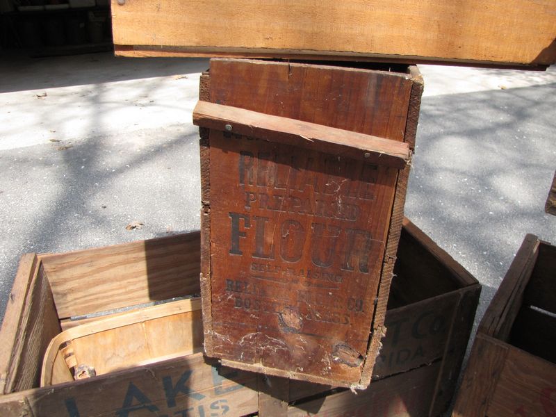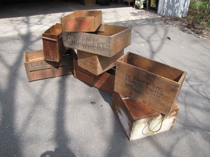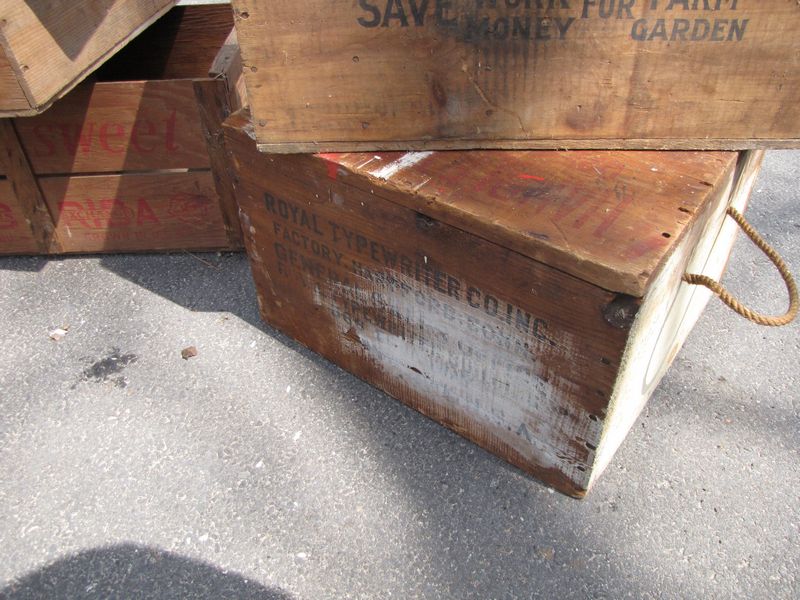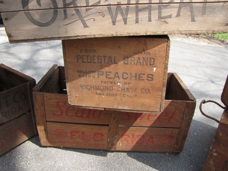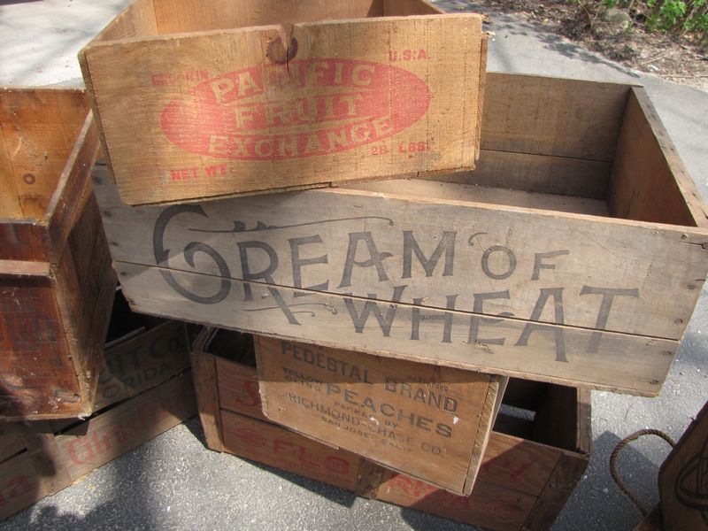 8 vintage advertising wooden crates including Lake Fruit company, Pacific Fruit Exchange, Reliable Flour, Cream of Wheat, Pedestal Brand Peaches, Sealed Sweet Citrus, Planet JR's, Royal Typewriter Co.