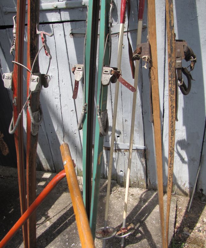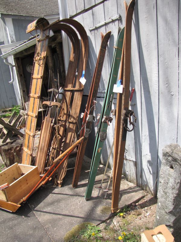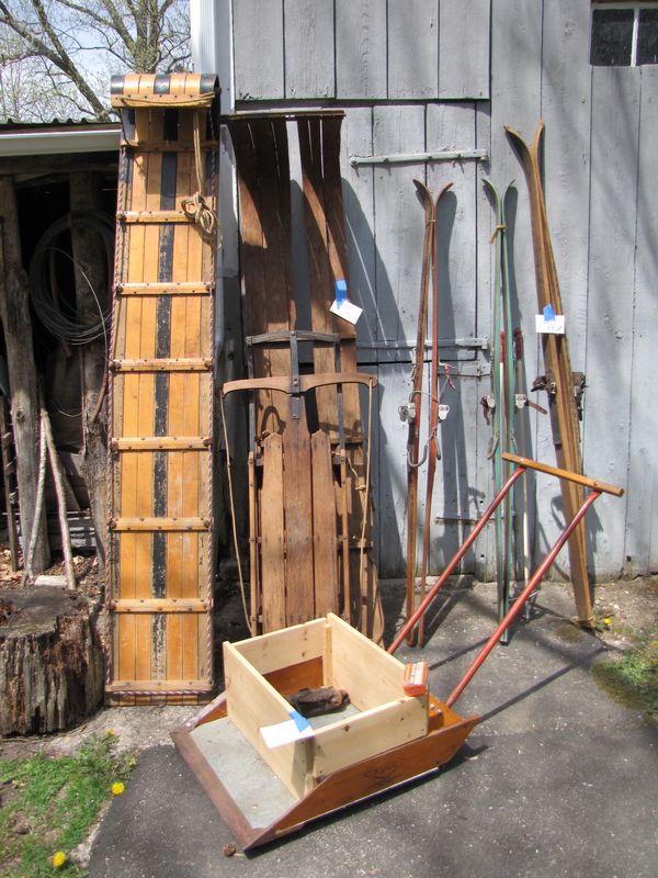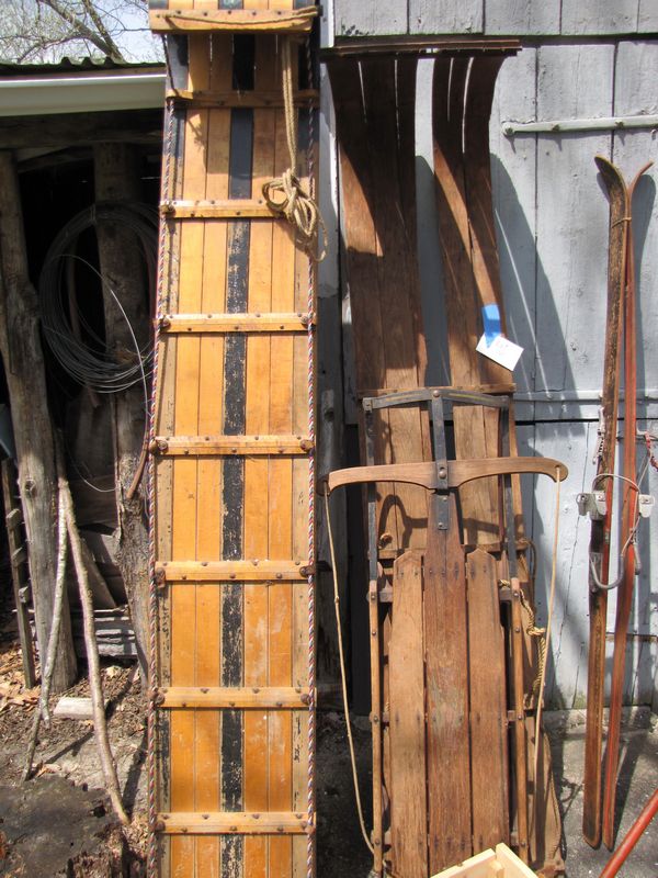Vintage and antique sleds, skis, etc., including 2 toboggans (one missing parts), a flexible Flyer sled, 3 pairs wooden skis, 1 set ski poles, and Rug snow scoop.