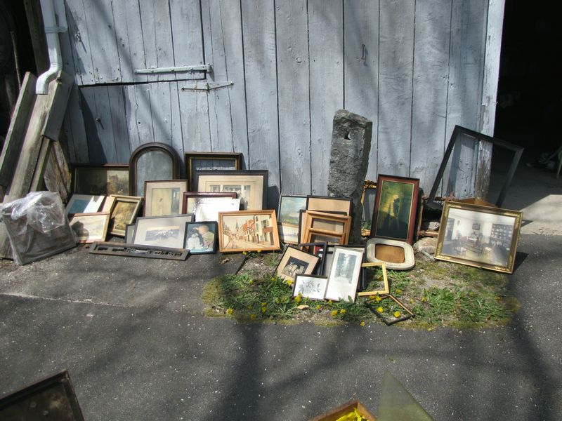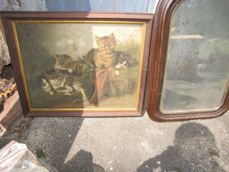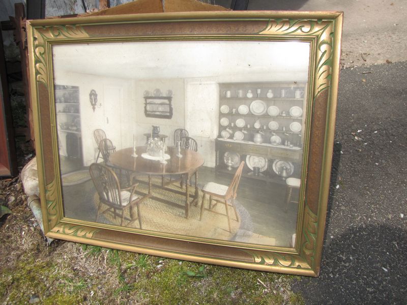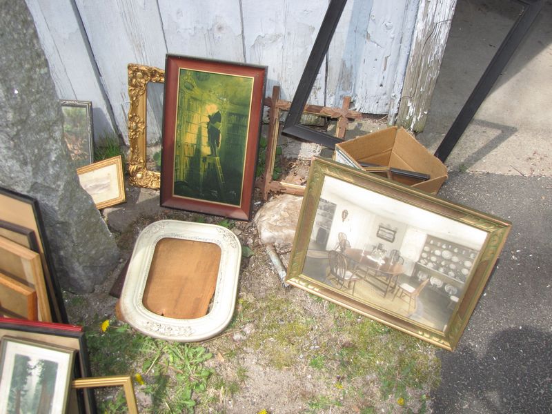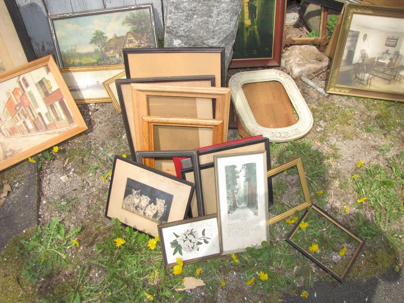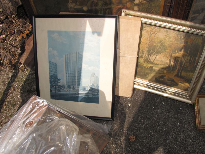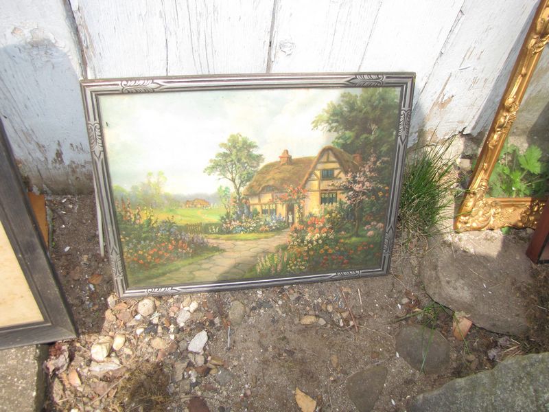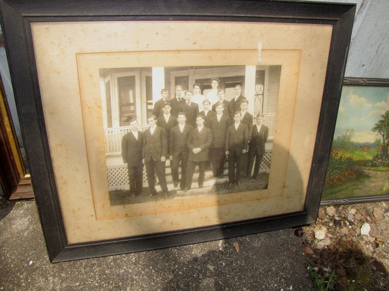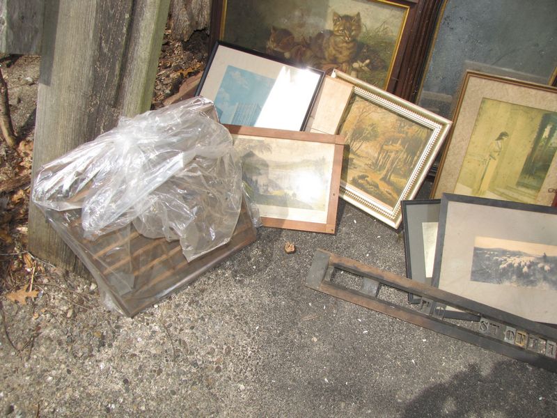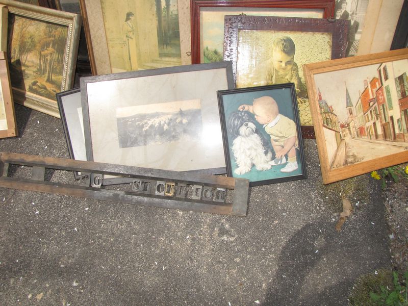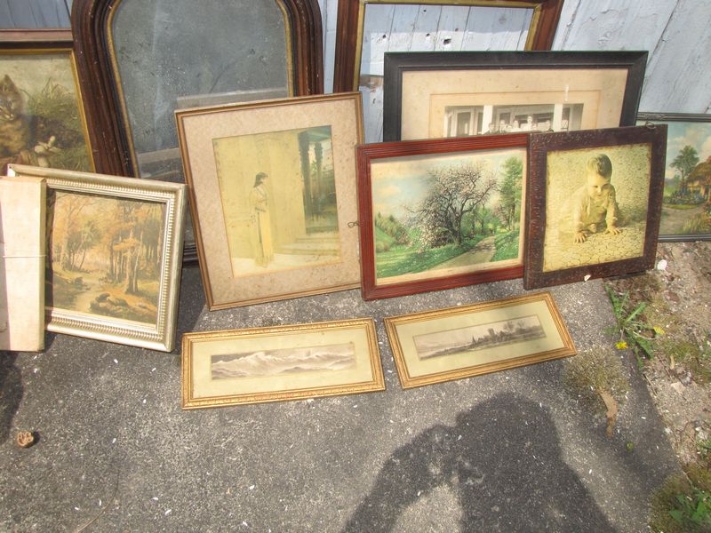 Artwork and frames including hand tinted David Davidson print with a dedication date of 1940 and deco frame, numerous other framed prints and artwork, framed graduation photo circa 1900, post office stencil, 2 printers trays. Some items have foxing. Large stone hitching post and other barn fixtures are not included.