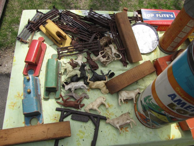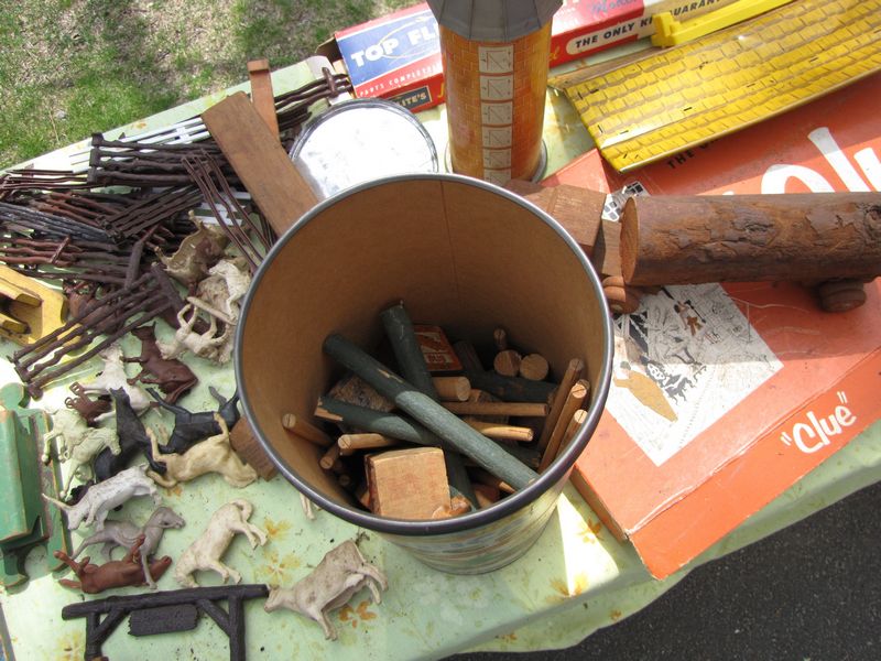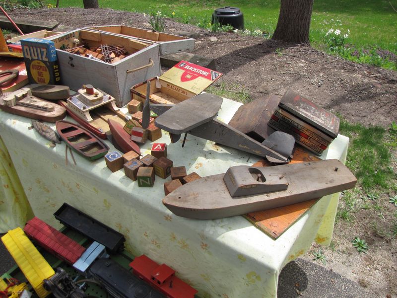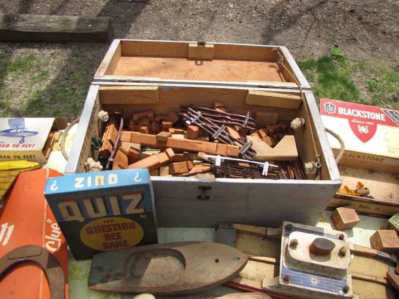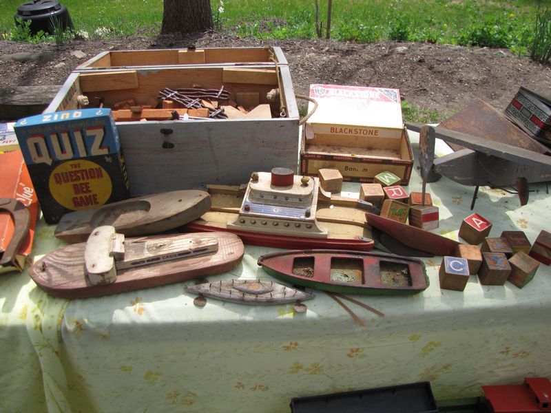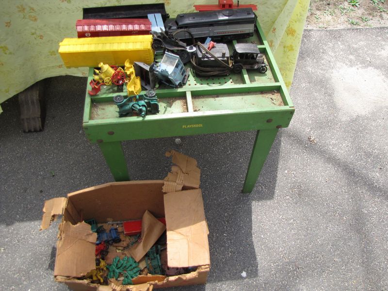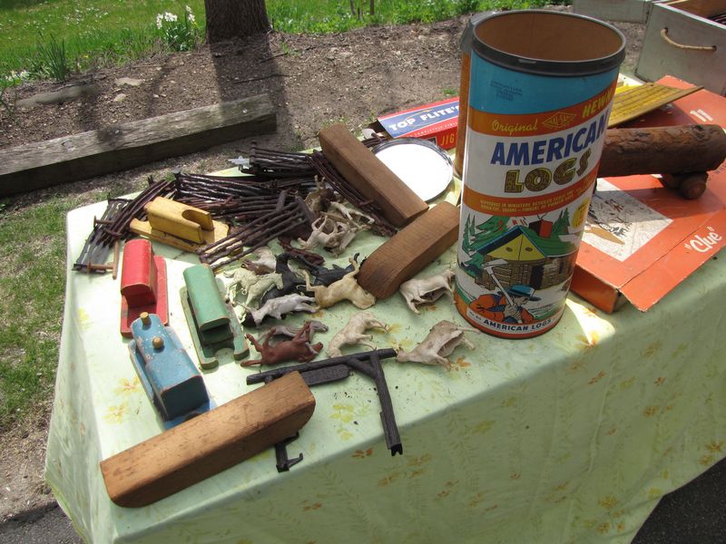 Vintage toys including folk art wooden toys, Lincoln Logs, plastic train set, early wooden blocks, wooden train set, wooden Playskool table, etc.