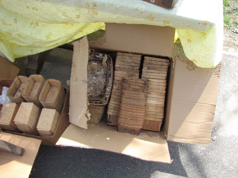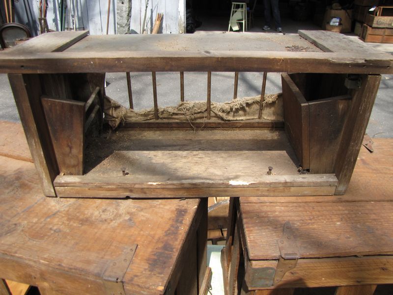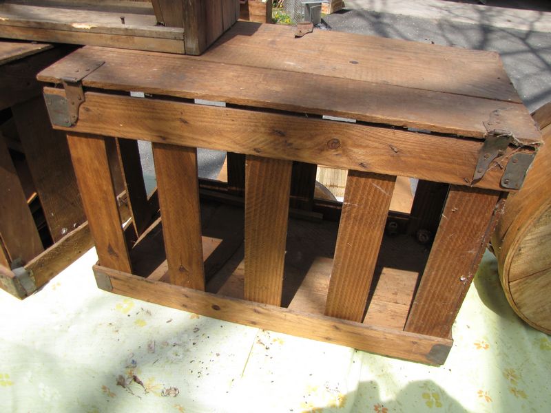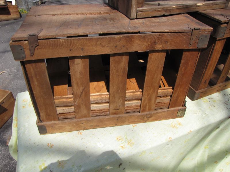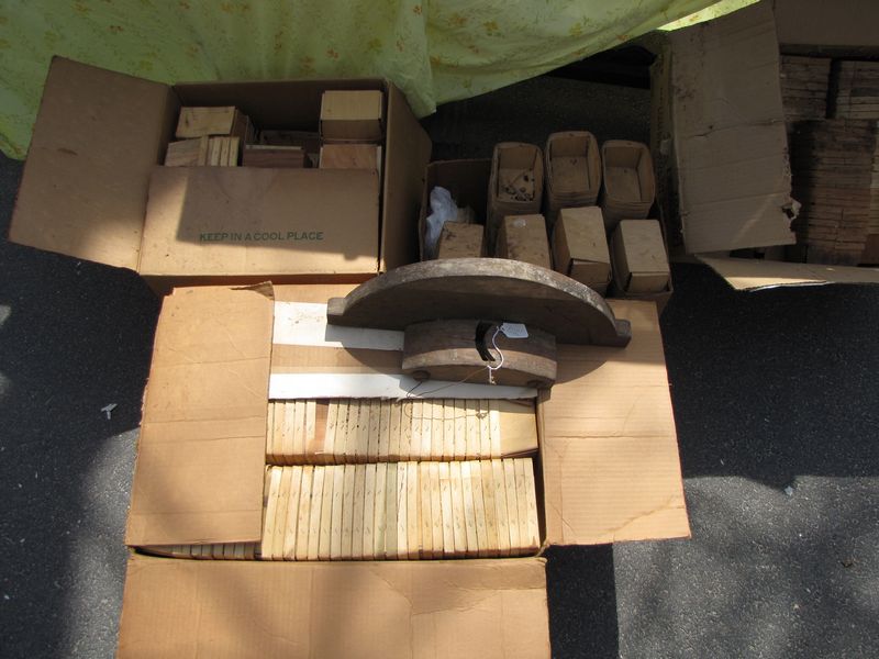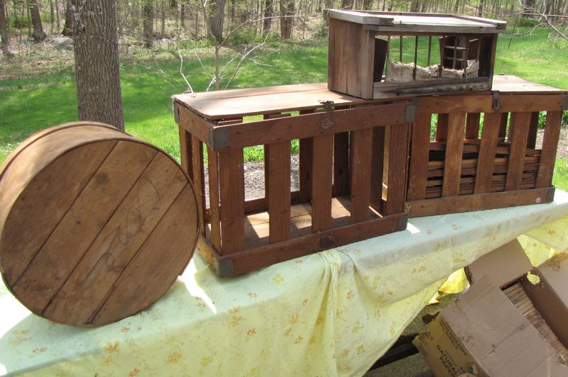 Misc. barn items including numerous berry baskets, chicken crates, cheese box, old barrel lathe, chicken feeder, some items mousey.