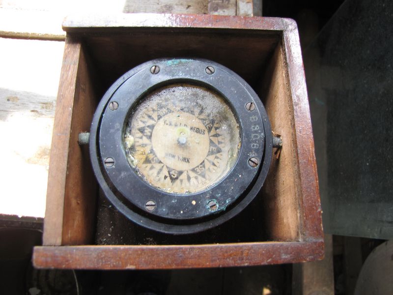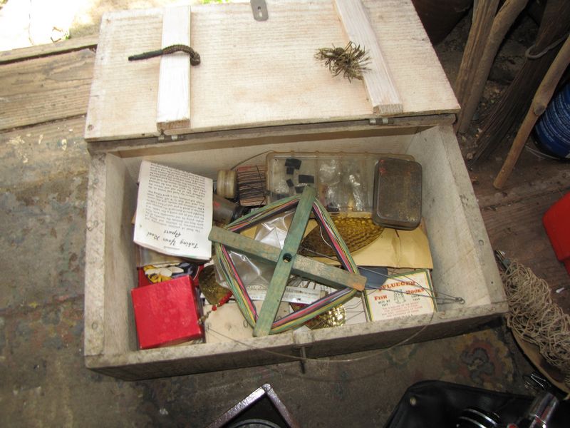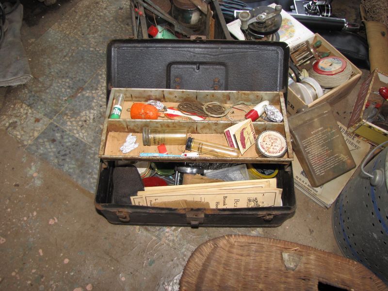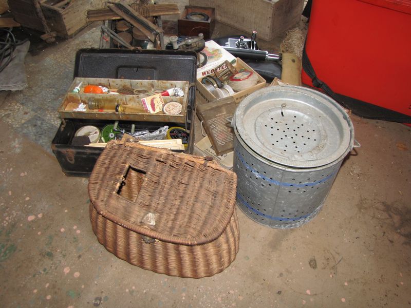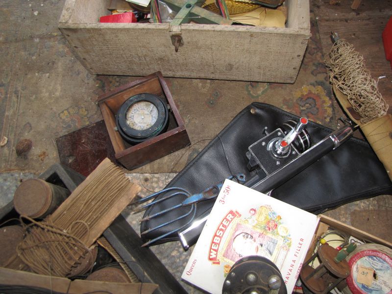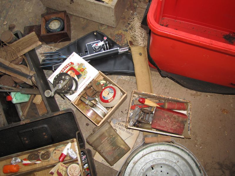 Vintage fishing gear including reels, small boat compass, various tackle.