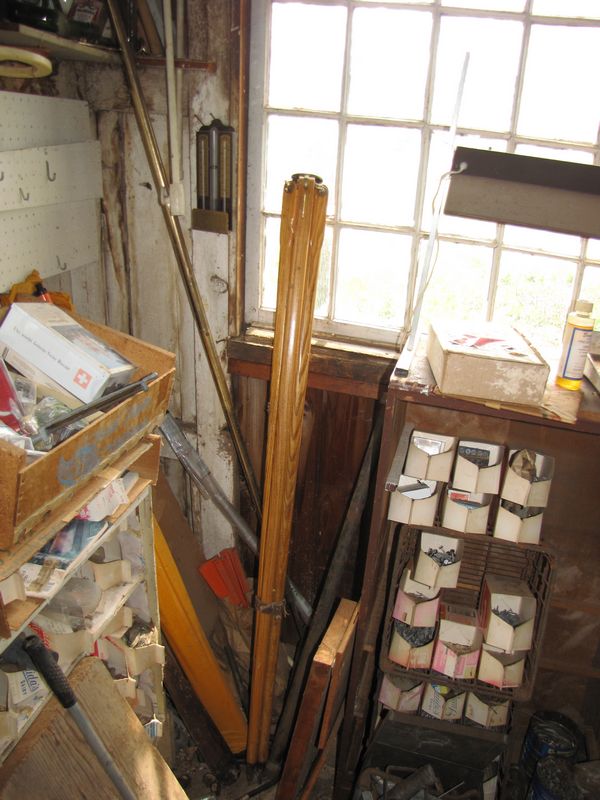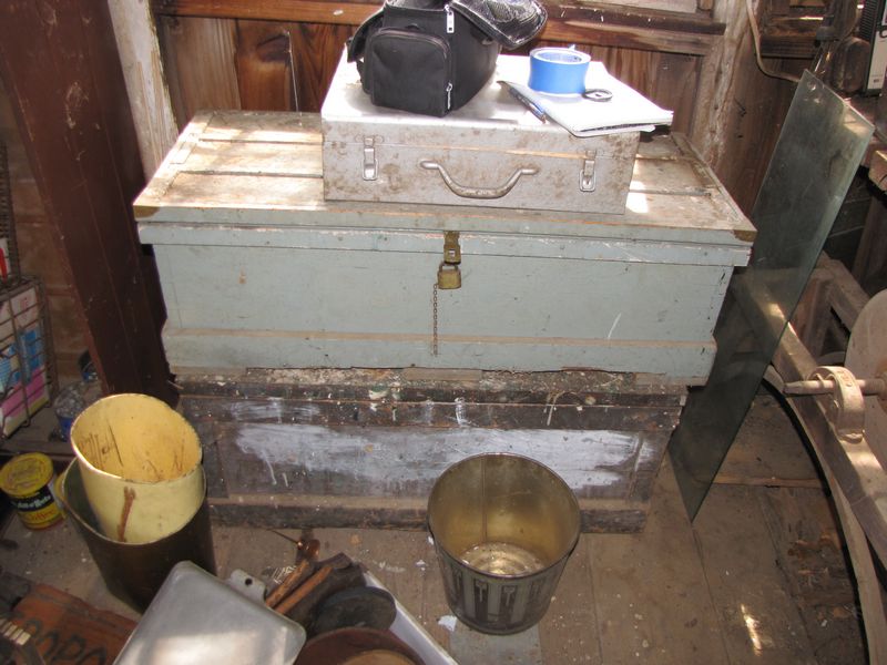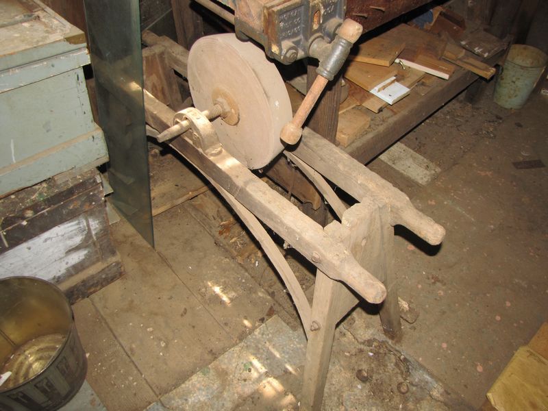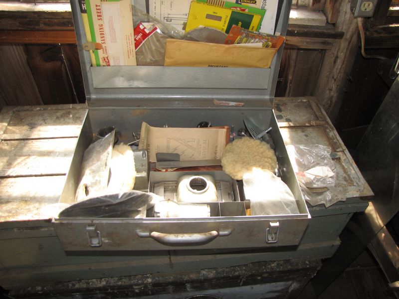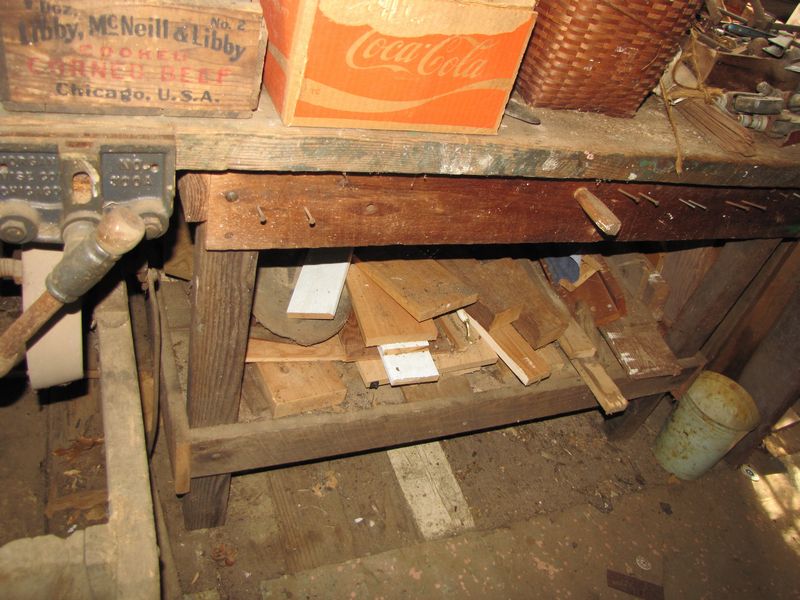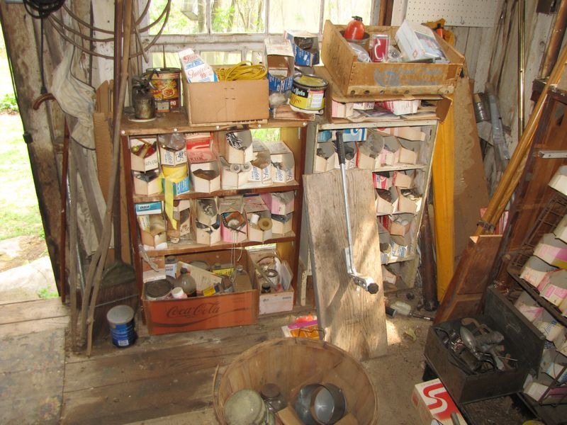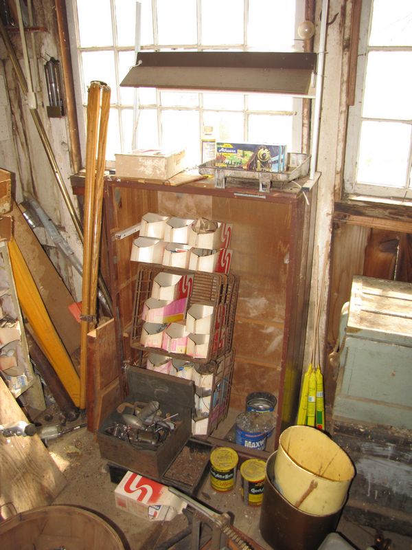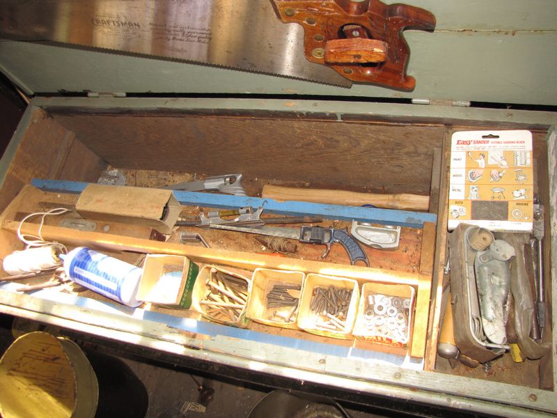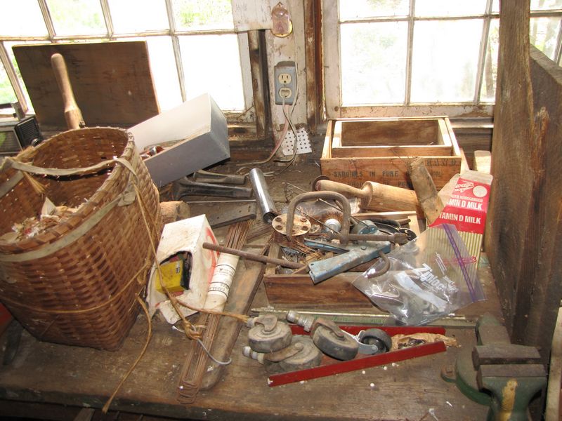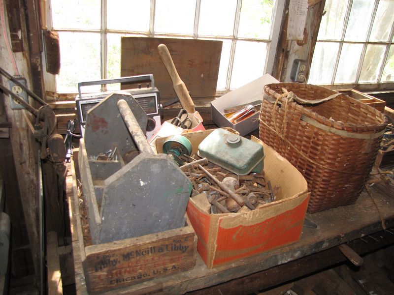 Vintage shop contents being sold buyer choice including tool bench items, sharpening stone, two carpenters tool chests with contents, other vintage tools, hardware, and more. Winning bidder may take what they want and leave the balance.