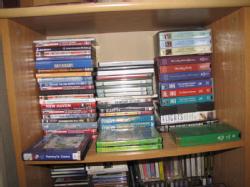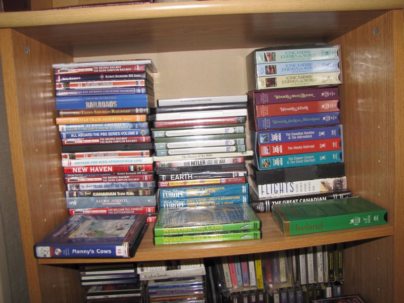 Large lot of books, videos, DVDs, cassettes, including history books, railroad books, books on collecting, some antique; cranberry glass lamp, office supplies, lots of road maps, etc. Plastic shelves included, a few boxes appearing in the photos on the floor along with built-in shelves and low white wood shelves are excluded. This lot is being sold buyer's choice, winning bidder may take what they want and leave the balance.