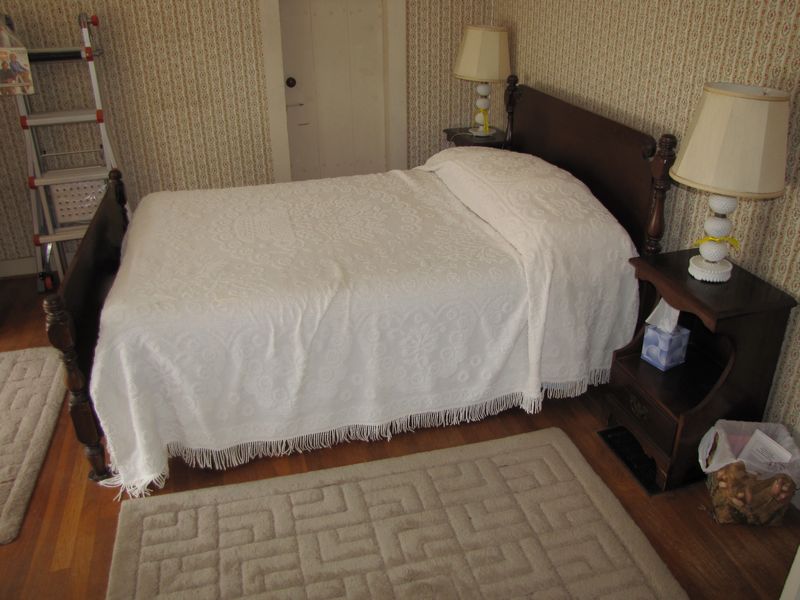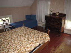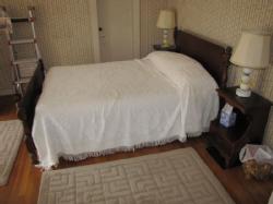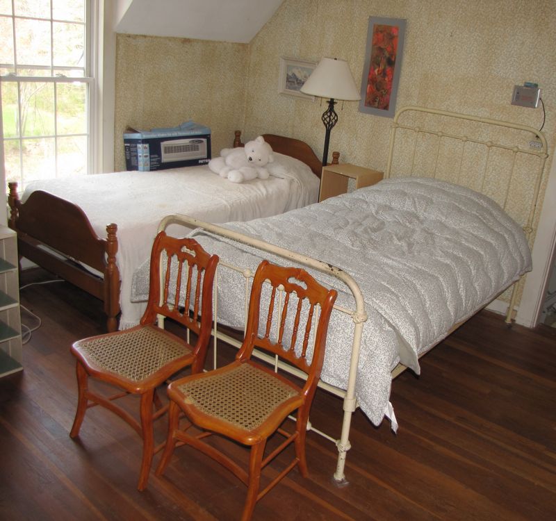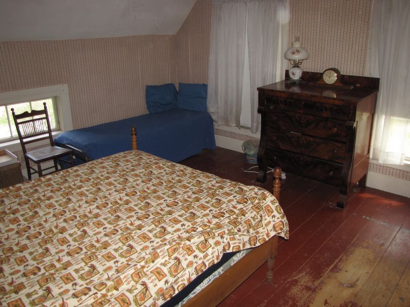Upstairs bedroom contents being sold buyer's choice, including antique dresser and mirror, 4 side chairs, an iron twin bed, ample twin bed, misc. books and pamphlets, record albums and clothing. Excludes vacuum cleaner, linens and bedding. Winning bidder may take what they want and leave the balance. Items are located on 2nd floor with narrow, steep staircase. Buyer must bring assistance to remove these items.