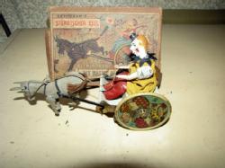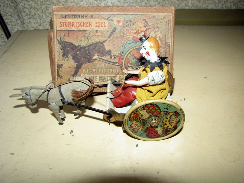 Vintage early 20th century tin toy, 8"L, made in Germany by Lehmann, called "The Balky Mule" with original box. Back panel of carriage missing.