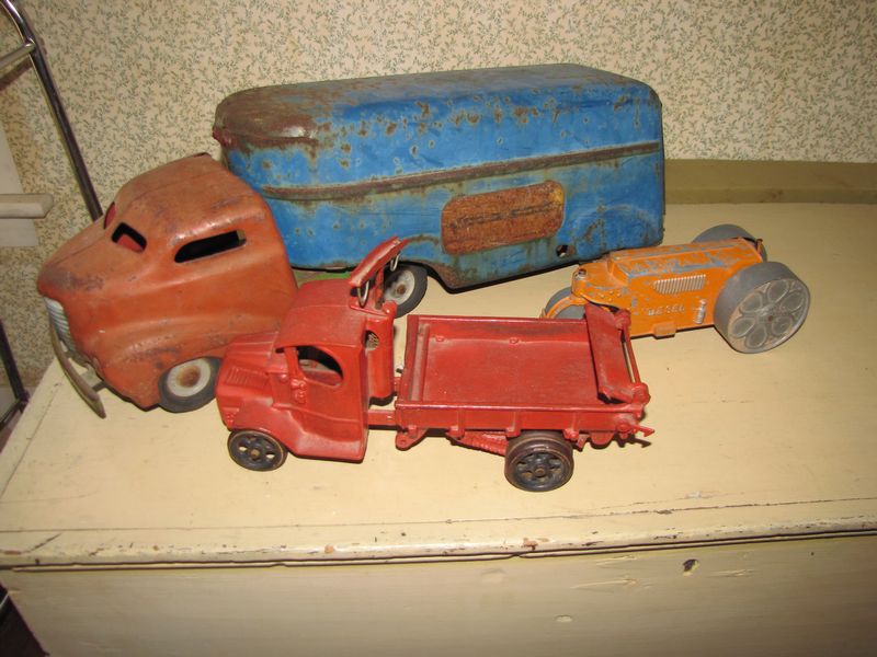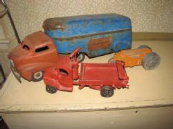 Vintage toys including a large toy Wyandotte circ. 1940"s metal truck with trailer. Has drop down back ramp, 23"L, has rust, cracks in metal, 1 tire is bad, missing piece that connects trailer to cab. With it is a vintage metal diesel tractor toy and cast iron truck toy.