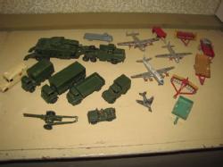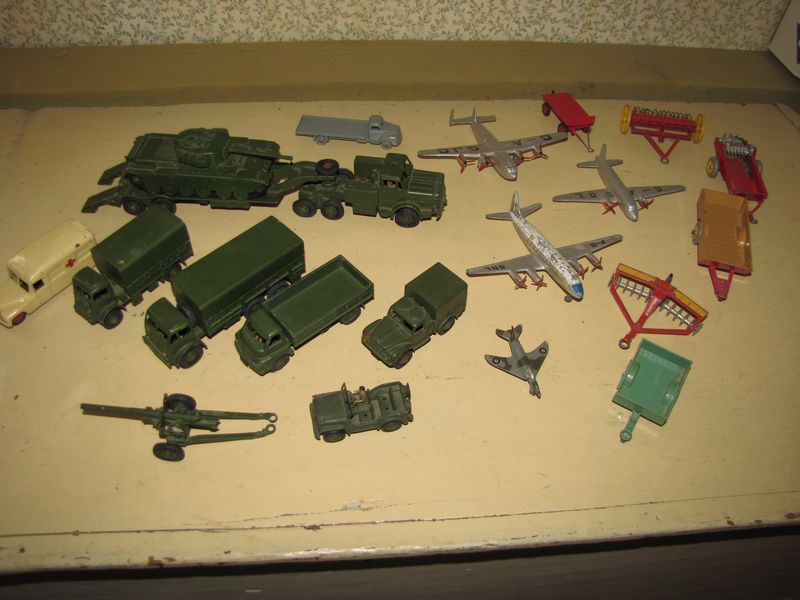 Lot of metal vintage Dinky toys, military vehicles, aircraft, farm vehicles, etc. Some items missing parts or damaged.