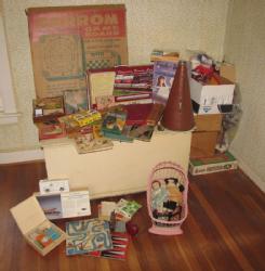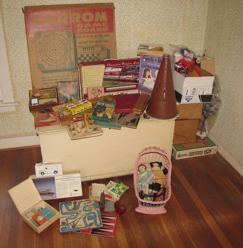 Antique painted blanket chest containing some blankets, 21"Tx41"Wx20"D, plus numerous vintage toys, games, an old megaphone, holiday items, a Carrom game board, etc. Items are located on 2nd floor with narrow, steep staircase. Buyer must bring assistance to remove these items.