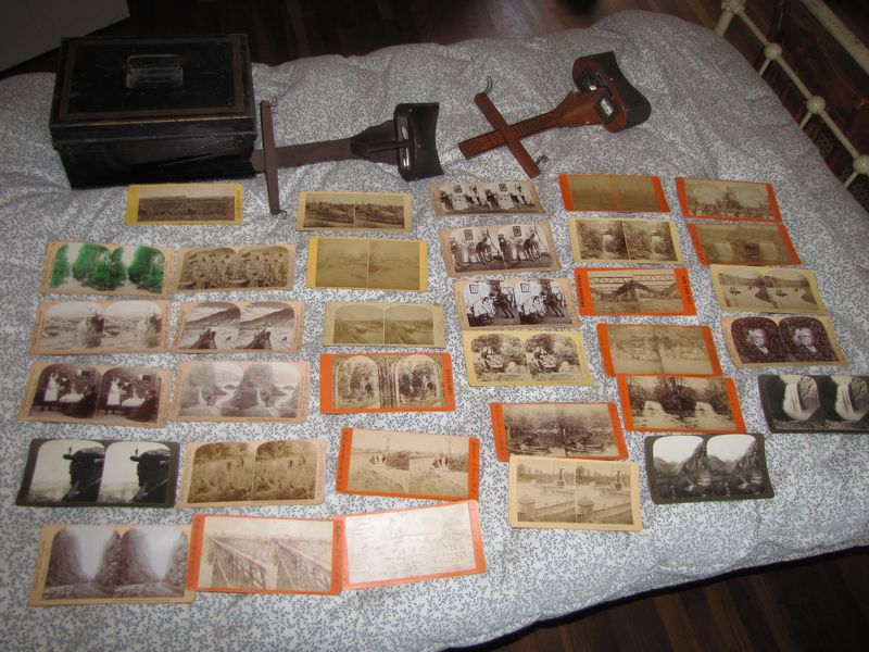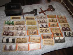 Lot includes 2 antique stereoscope slide viewers, 1 Keystone Stereoscope, and an older unlabeled stereoscope, 34 slides. Some slides are faded. Also included is a tole document box.