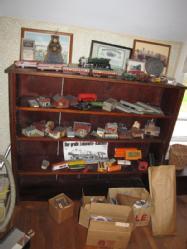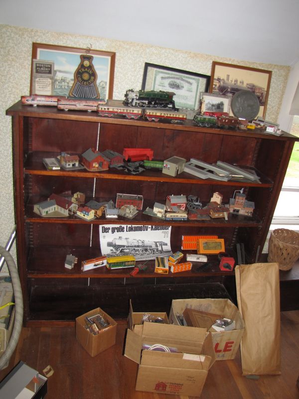 Large lot of model railroad items and railroad collector memorabilia, various gauges, track, locomotive telephone, wooden trains, etc. Bookcase not included.