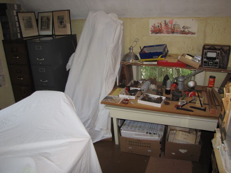 Misc. items including vintage cameras and photography related items, drafting items, railroad memorabilia items, books, maps, 2 file cabinets including a vintage wooden file cabinet, three 1914 Yale University prints, railroad photos, corner spool leg table, prints, etc. Winning bidder may take what they want and leave the balance. Items are located on 2nd floor with narrow, steep staircase. Buyer must bring assistance to remove large items.
