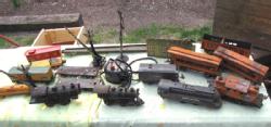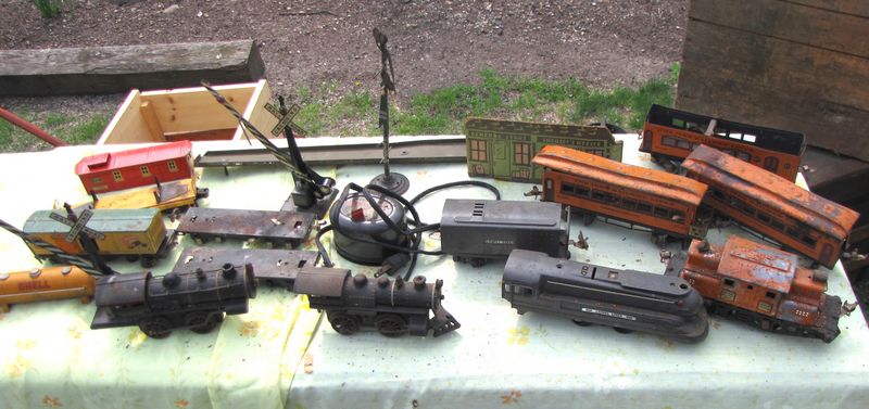 Vintage model railroad items including Ives #17 windup engine, Ives #25 windup engine, Ives #3254 electric engine, Lionel 1688 engine, misc. Lionel and Ives train cars, American Flyer transformer, etc. All items are in fair to poor condition with some missing parts. Other items appearing in photo not included.