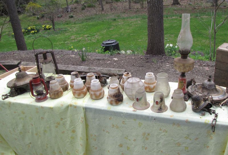 Vintage light fixtures, lanterns, shades, and chimneys. All are dirty from long term barn storage, some may be damaged.