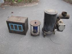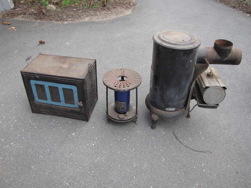 3 vintage tin stoves including New Perfection #122GE, New Perfection 61B with blue chimney, and a Florence Stove Company stove. Functionality unknown.